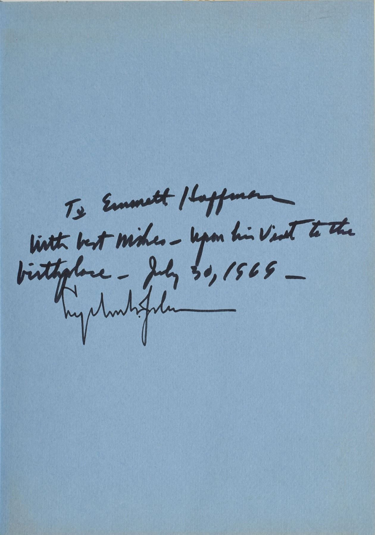 Signed book: This America. First edition. NY: Random House, 1966. Hardcover with dust jacket, 8.75 x 11.75, 174 pages. Signed and inscribed on the first free end page in black felt tip, "To Emmett Hoffman, with best wishes—upon his visit to the birthplace—July 30, 1969—Lyndon B. Johnson," who uses different felt tip markers for the inscription and signature. In fine condition, with tears to the dust jacket.