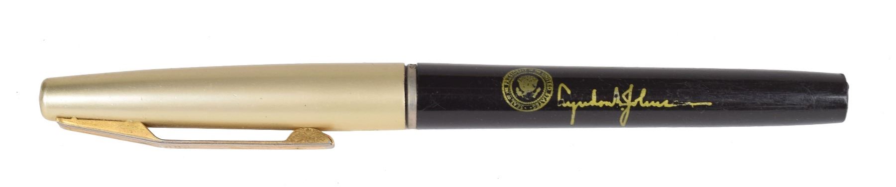 Original pencil doodle by President Lyndon B. Johnson accomplished on a sheet of 4.5 x 7 "Aboard Air Force One" stationery, done on May 17, 1966, as a visual aid to explain the complicated situation in Vietnam. Includes a letter to noted bibliophile Philip D. Sang from Congressman Sidney R. Yates on House of Representatives letterhead, May 19, 1966, in part: "I am enclosing the 'visual aid doodle' which President Lyndon B. Johnson drew during his explanation of his concept of what was happening in the Vietnamese war. It occurred aboard the plane, Air Force One, on the afternoon of May 17 while the President and the congressional delegation were flying to the fund raising dinner to be held in Chicago that evening. The top circle, he explained, was Hanoi. The lower circle on the left was Haiphong. The corridor represented by the parallel lines was the flow of men and supplies from North Vietnam into Danang. The square in the margin represented what he called 'Pol'—not explained, but assumed to be a power and light installation. I don't remember what was represented by the numerals 85 and 55. The explanation for the diagram, of course, was that he was beset with the question of how to stop the flow of men and materiel from North Vietnam into South Vietnam. The various pencil marks that are scattered throughout the sheet were made as he emphasized points in his explanation. Congressman Pucinski took the first two sheets of this three sheet doodle, while I took the third one." In fine condition, with scattered light creasing. Accompanied by an original official Lyndon B. Johnson bill signing pen, imprinted with his facsimile signature on the side, as typically given to politicians, reporters, and guests at bill signings and other events.