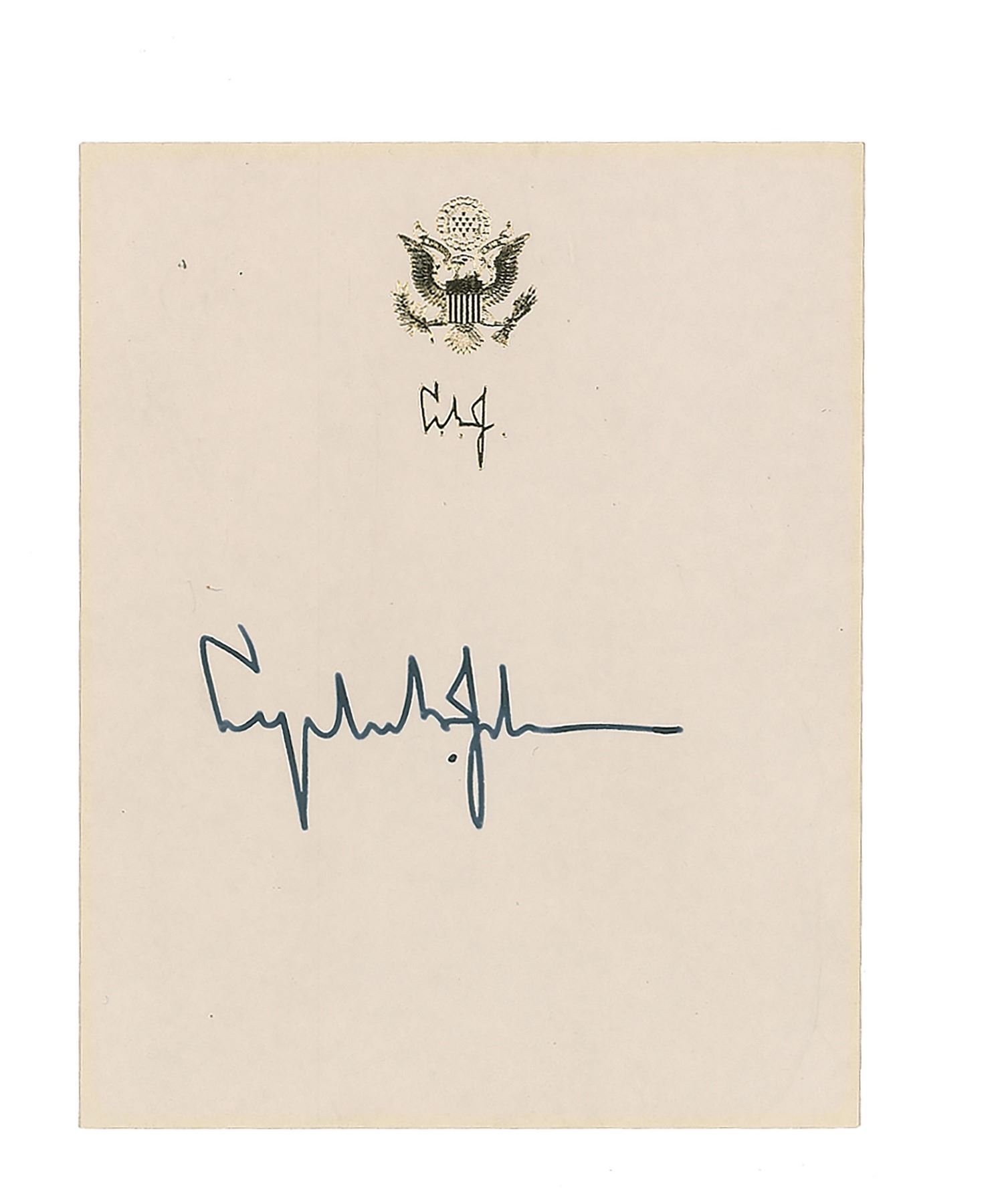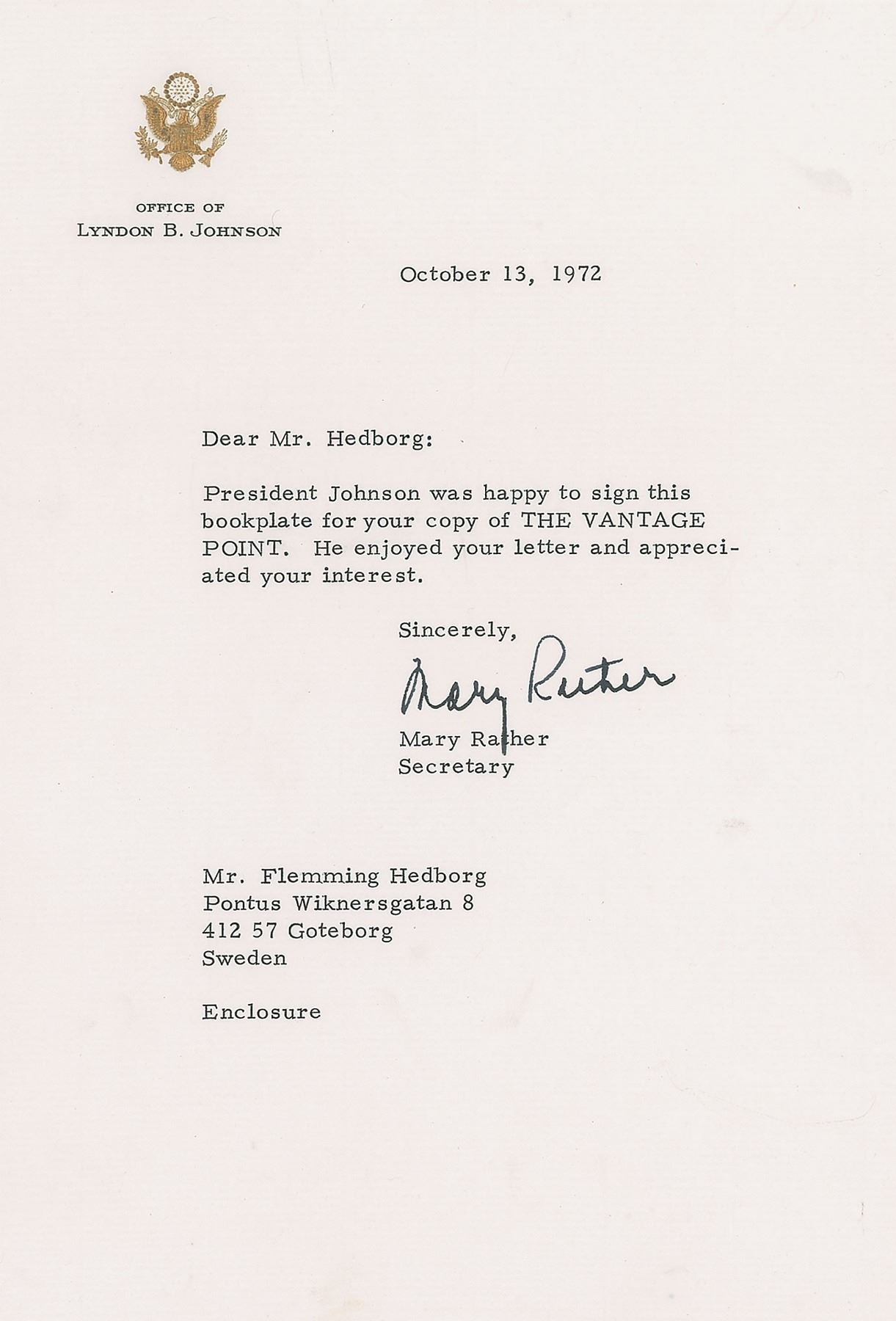 Official bookplate for The Vantage Point gilt-stamped with the presidential seal, 3.75 x 4.75, signed in fountain pen by Johnson. In fine condition, with a paperclip impression to the top edge. Accompanied by a transmittal letter from his assistant, dated October 13, 1972.