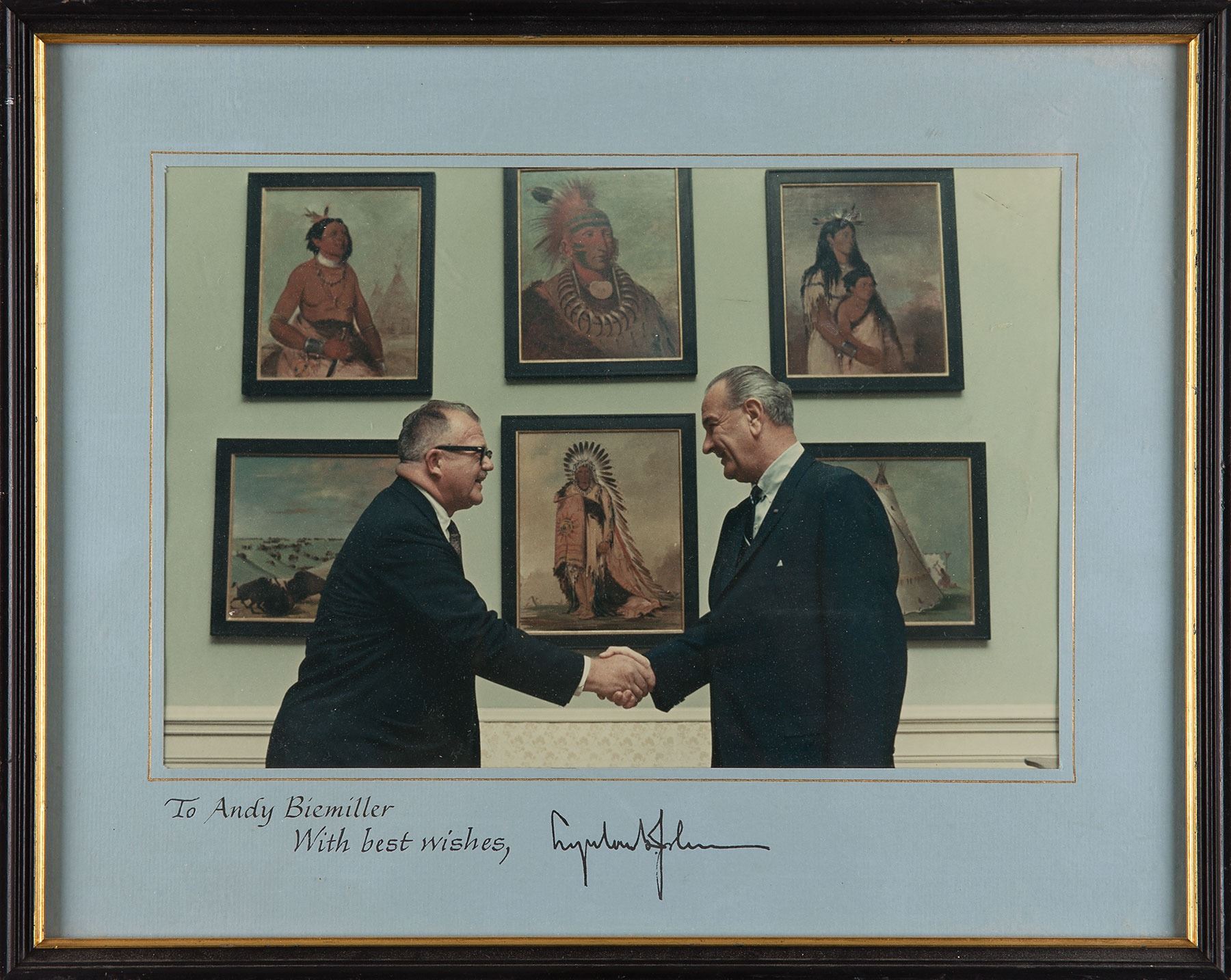 Color semi-glossy 11 x 7.5 photo of Johnson shaking hands with Wisconsin Congressman Andrew Biemiller in front of a Native American exhibition, calligraphically inscribed on the mat, "To Andy Biemiller, with best wishes," and signed in black ink by Johnson’s actual signature. Framed to an overall size of 15 x 12. In fine condition. Biemiller was a congressman and chief lobbyist for the AFL-CIO. He played a key role in the passage of civil rights, medicare, and similar legislation during the administrations of JFK and LBJ.