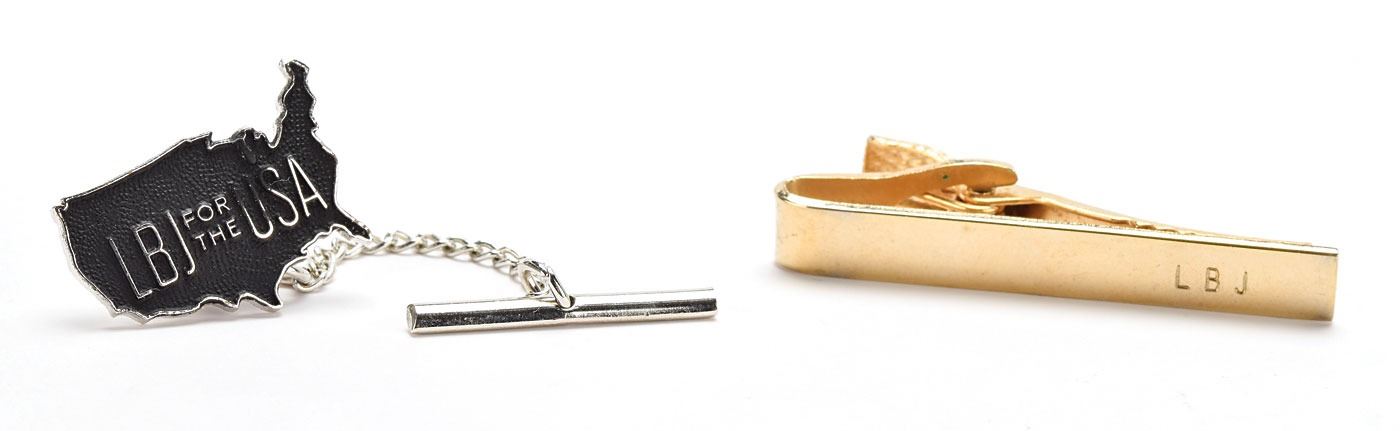 Two pieces of campaign jewelry produced for Lyndon B. Johnson's political bids in the early 1960s, including: a gold-plated tie clasp, 1.75? in length, with bar pin engraved "LBJ"; and a silver-tone lapel pin in the shape of the United States, .75 x .5, with front featuring raised lettering, "LBJ for the USA," and the back engraved, "DNC 1964." Lapel pin includes clutch backing and chain. In overall fine condition. From the estate of Secret Service Agent Warren W. 'Woody' Taylor. On November 22, 1963, the day of President Kennedy's assassination, Taylor was on assignment in Dallas working as a Special Agent on Vice Presidential detail to protect Lady Bird Johnson. Taylor was in the vehicle immediately behind the Vice President's car in the Presidential motorcade.