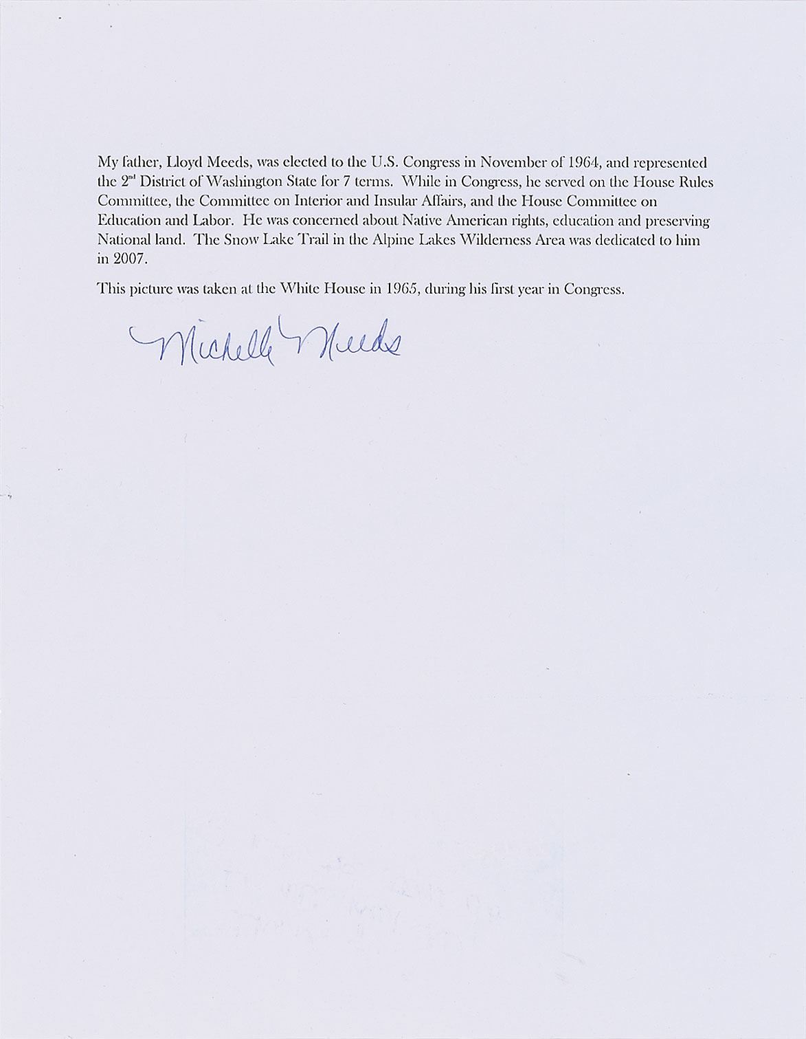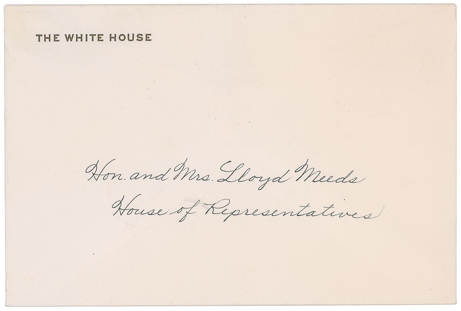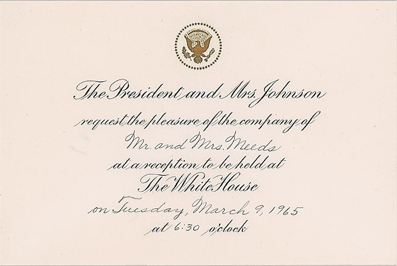 Accompanied by an official White House photo of President and Lady Bird Johnson meeting with Washington Congressman Lloyd Meeds and his wife, Barbara, affixed to the original 11 x 12.5 mount, which has been secretarially signed and inscribed. The pen is also accompanied by a letter of provenance from the daughter of Meeds, which reads: “My Father, Lloyd Meeds, was elected to the U.S. Congress in November of 1964, and represented the 2nd District of Washington State for 7 terms. While in Congress, he served on the House Rules Committee, the Committee on Interior and Insular Affairs, and the House Committee on Education and Labor. He was concerned about Native American rights, education and preserving National land. The Snow Lake Trail in the Alpine Lakes Wilderness Area was dedicated to him in 2007. [The referenced] picture was taken at the White House in 1965, during his first year in Congress.” Also includes an official presidential invitation to the White House for March 9, 1965, in its original White House envelope addressed to "Hon. and Mrs. Lloyd Meeds, House of Representatives."