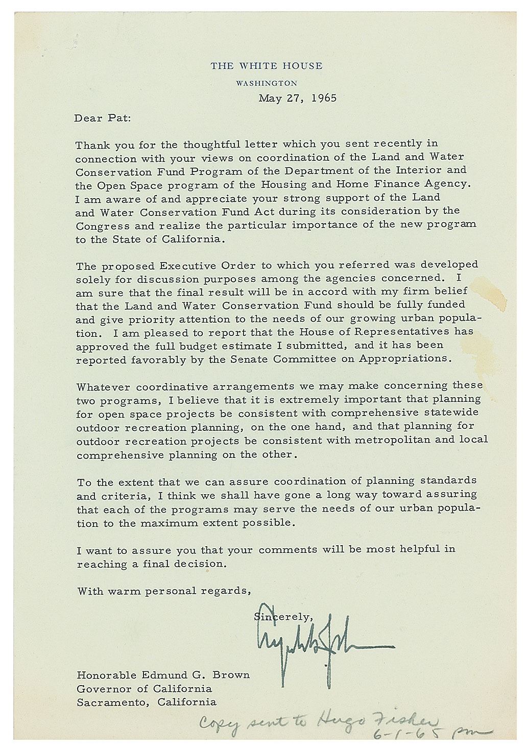 TLS, one page, 7 x 10.25, White House letterhead, May 27, 1965. Letter to California Governor Pat Brown, in part: "Thank you for the thoughtful letter which you sent recently in connection with your views on coordination of the Land and Water Conservation Fund Program of the Department of the Interior and the Open Space program of the Housing and Home Finance Agency. I am aware of and appreciate your strong support of the Land and Water Conservation Fund Act during its consideration by the Congress and realize that particular importance of the new program to the State of California. The proposed Executive Order to which you referred was developed solely for discussion purposes among the agencies concerned. I am sure that the final result will be in accord with my firm belief that the Land and Water Conservation Fund should be fully funded and give priority attention to the needs of our growing urban population. I am pleased to report that the House of Representatives has approved the full budget estimate I submitted, and it has been reported favorably by the Senate Committee on Appropriations." In very good to fine condition, with staple holes to the upper left corner, a crease to the lower left corner, and a couple of light stains to the right edge.