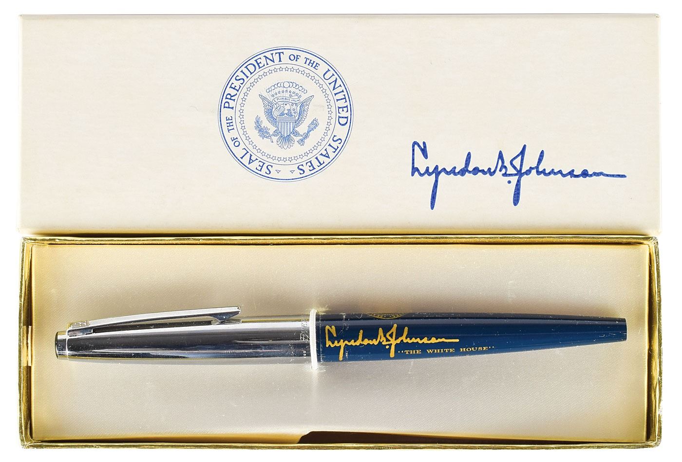Historic fountain pen used by President Lyndon B. Johnson to sign the ‘Act to amend the Immigration and Nationality Act, and for other purposes' (H. R. 2580). The official 'bill signer' Eversharp pen measures 5.25? long and features a navy blue plastic barrel bearing a gold facsimile signature with presidential seal and a silver-tone cap section. Includes the original presentation box with presidential seal and facsimile signature of President Johnson, as well as a typed caption affirming that the pen was “used by the President, October 3, 1965, in signing H. R. 2580.” The steel nib is not included. In fine condition. The Immigration and Nationality Act of 1965, also known as the Hart–Celler Act, abolished the quota system based on national origins that had been American immigration policy since the 1920s. The 1965 Act marked a change from past US policy which had discriminated against non-northern Europeans. In removing racial and national barriers the Act would significantly alter the demographic mix in America.