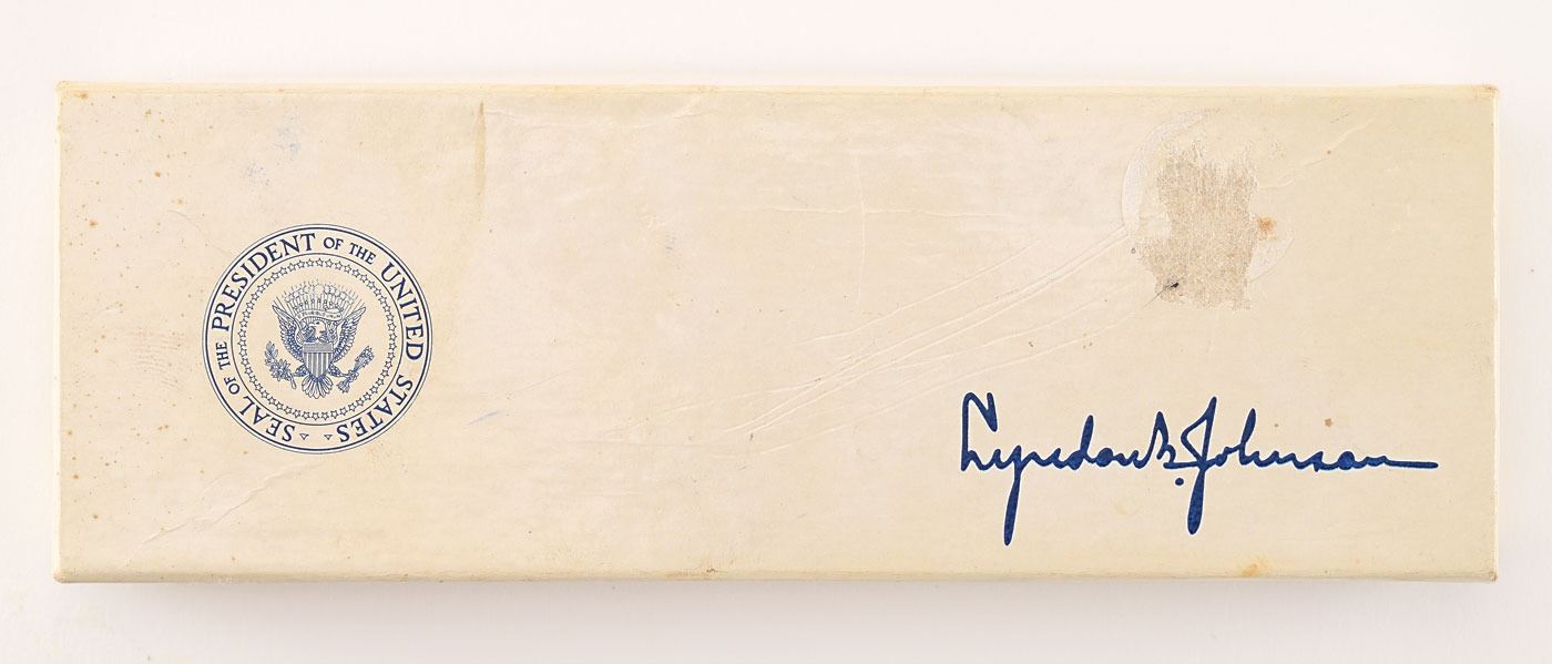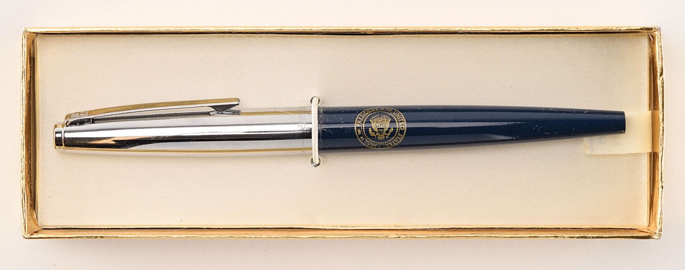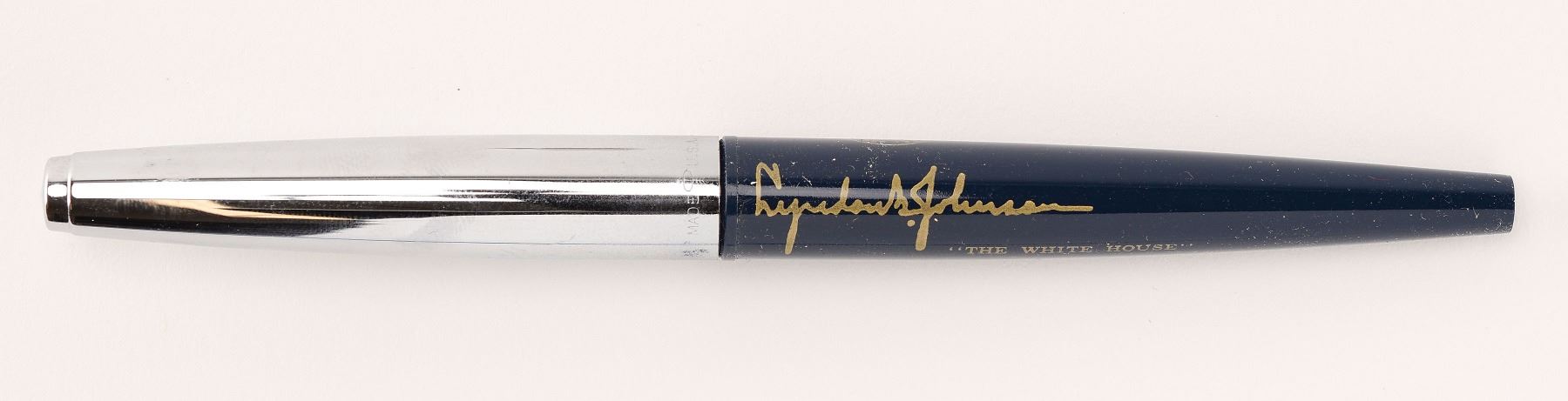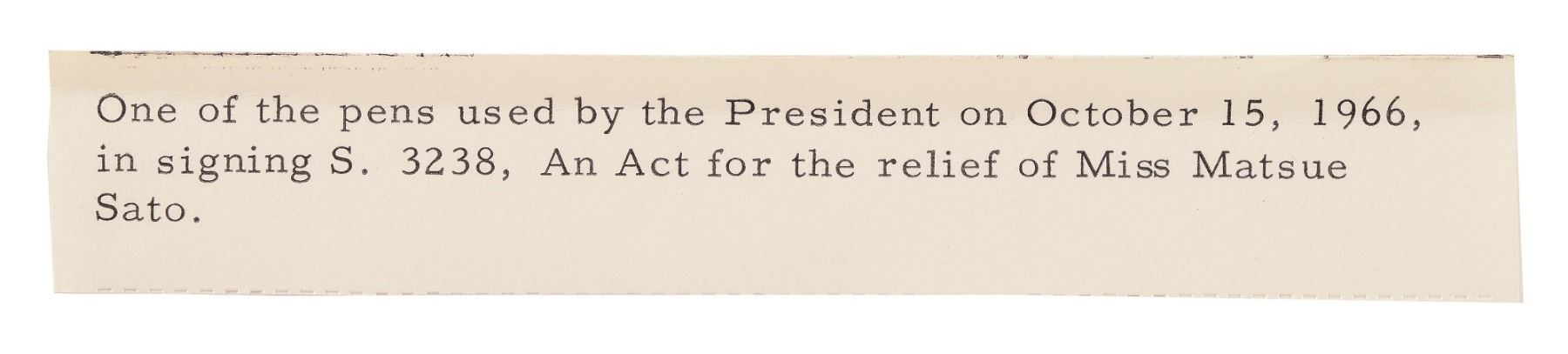 Felt tip pen used by President Lyndon B. Johnson to sign the ‘Act for the relief of Miss Matsue Sato’ (S. 3238). The official 'bill signer' Eversharp pen measures 5.25? long and features a navy-blue plastic barrel bearing a gold facsimile signature with presidential seal and a silver-tone cap section. Accompanied by the original presentation box with presidential seal and facsimile signature of President Johnson, as well as a typed caption: “One of the pens used by the President on October 15, 1966, in signing S. 3238, An Act for the relief of Miss Matsue Sato.” In fine condition, with some light wear to box.