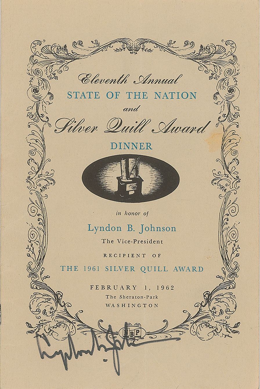 Program for the 11th Annual State of the Nation and Silver Quill Award Dinner held at the Sheraton-Park Hotel in Washington, D.C., on February 1, 1962, eight pages, 6 x 9, signed on the front cover in black felt tip by Lyndon B. Johnson. In very good to fine condition, with a light stain, some light handling wear, and a central vertical fold.