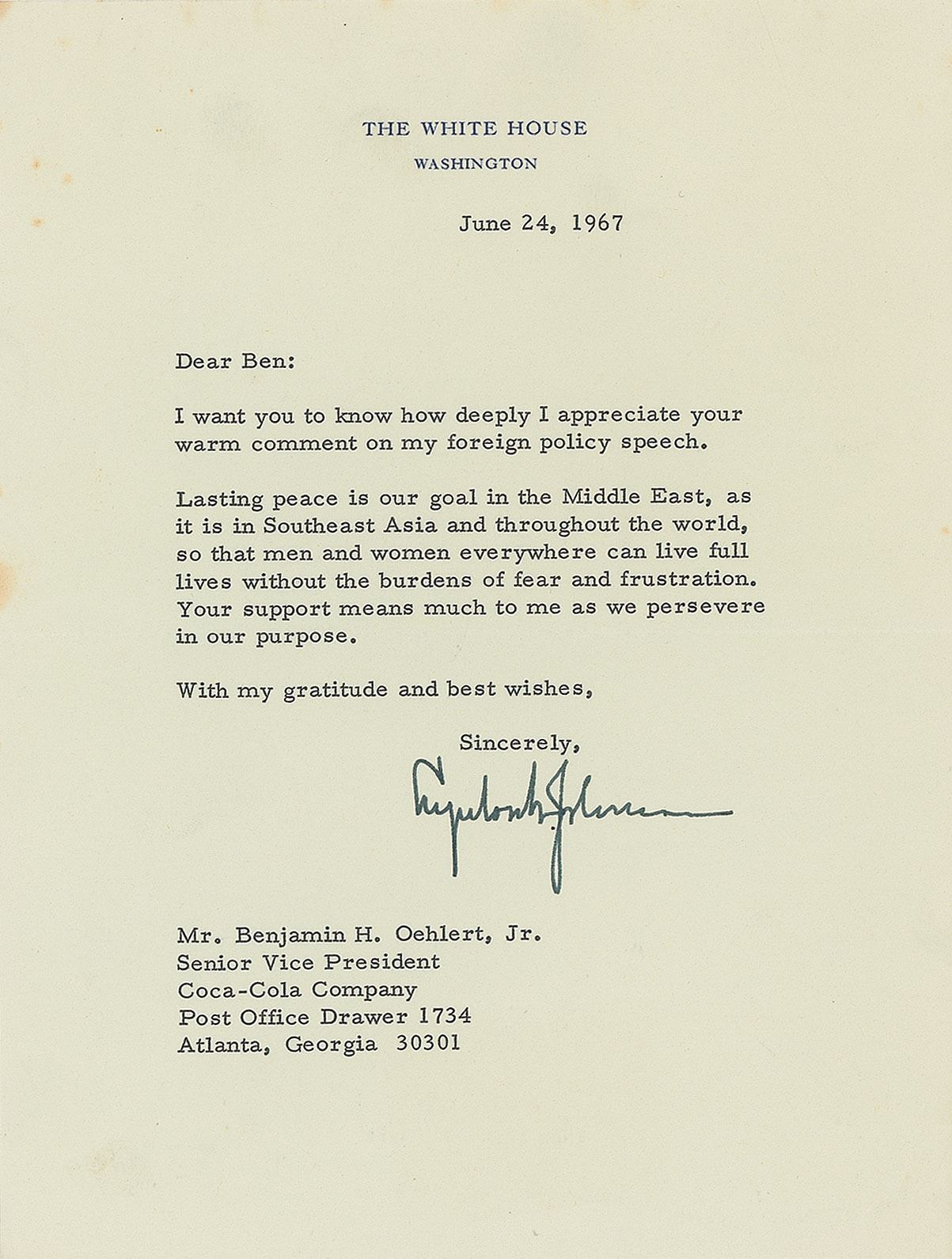 TLS as president, one page, 6.75 x 8.75, White House letterhead, June 24, 1967. Letter to Ben Oehlert, in part: "I want you to know how deeply I appreciate your warm comment on my foreign policy speech. Lasting peace is our goal in the Middle East, as it is in Southeast Asia and throughout the world, so that men and women everywhere can live full lives without the burdens of fear and frustration. Your support means much to me as we persevere in our purpose." In fine condition, with a few small stains to the left edge.