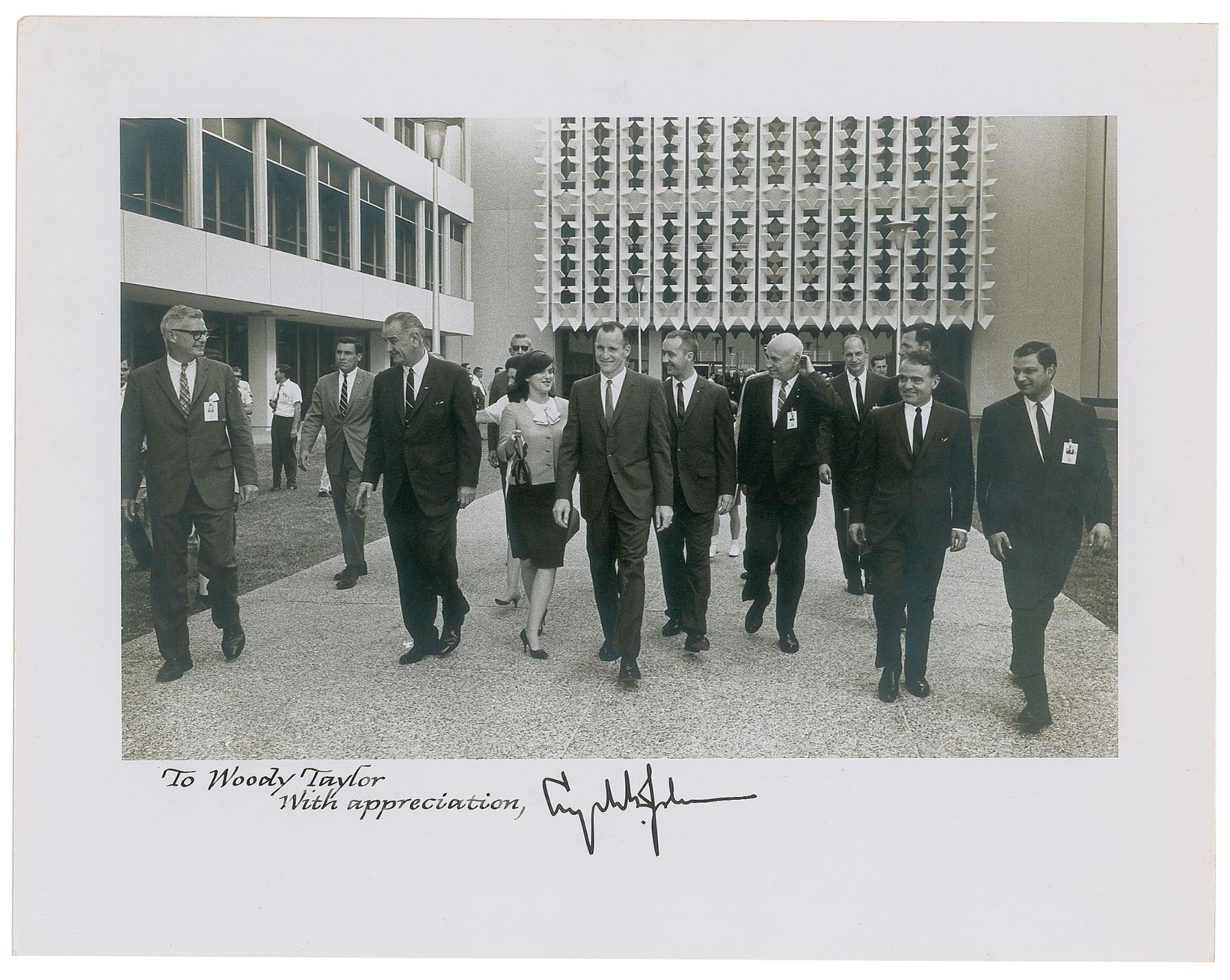 Vintage matte-finish 14 x 11 photo of President Johnson walking with the Gemini 4 crew (Ed White and Jim McDivitt) at the Manned Spacecraft Center in Houston, calligraphically inscribed in the lower border to a Secret Service agent, "To Woody Taylor, With appreciation," and signed in fountain pen, "Lyndon B. Johsnon." In very good to fine condition, with a few creases to the right side, and light silvering to the darker areas of the image. Taylor was an agent for the Secret Service who was on detail in Dallas at the time of JFK's assassination, and later interviewed by the Warren Commission.