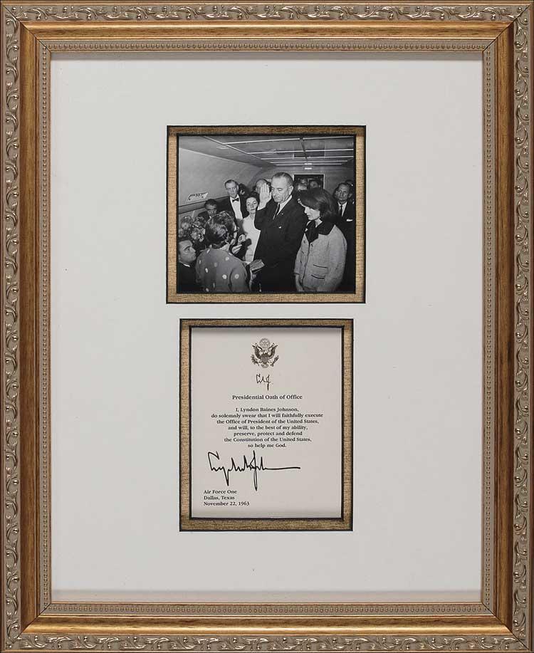 Black felt tip signature on a 3.75 x 4.75 LBJ bookplate with a gold-stamped American eagle, to which was later added the presidential Oath of Office and “Air Force One, Dallas, Texas, November 22, 1963.” Double matted and framed with a photo of Johnson taking the oath of office on aboard Air Force One, to an overall size of 13 x 16.25. In very fine condition. Pre-certified John Reznikoff/PSA/DNA and RRAuction COA.