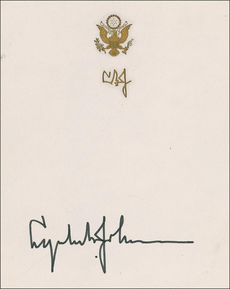 Two embossed LBJ bookplates, each 4 x 4.75, each signed in black felt tip, “Lyndon B. Johnson.” In fine condition.