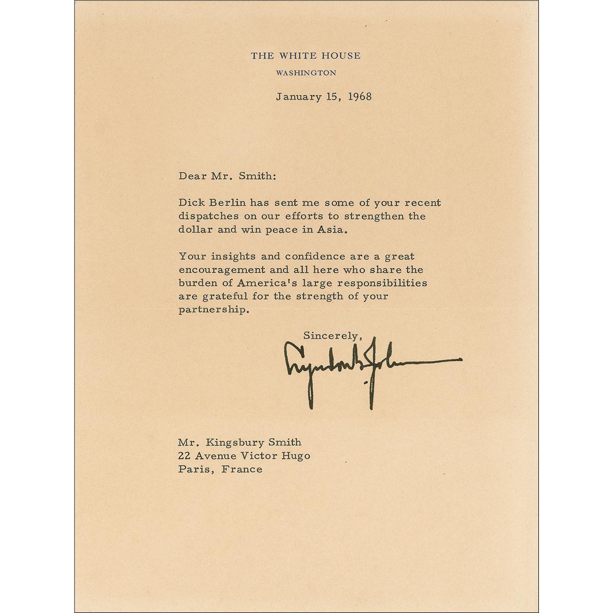 TLS as president, one page, 6.75 x 9, White House letterhead, January 15, 1968. Letter to Kingsbury Smith in Paris. In full: “Dick Berlin has sent me some of your recent dispatches on our efforts to strengthen the dollar and win peace in Asia. Your insights and confidence are a great encouragement and all here who share the burden of America’s large responsibilities are grateful for the strength of your partnership.” In fine condition, with uniform overall toning.