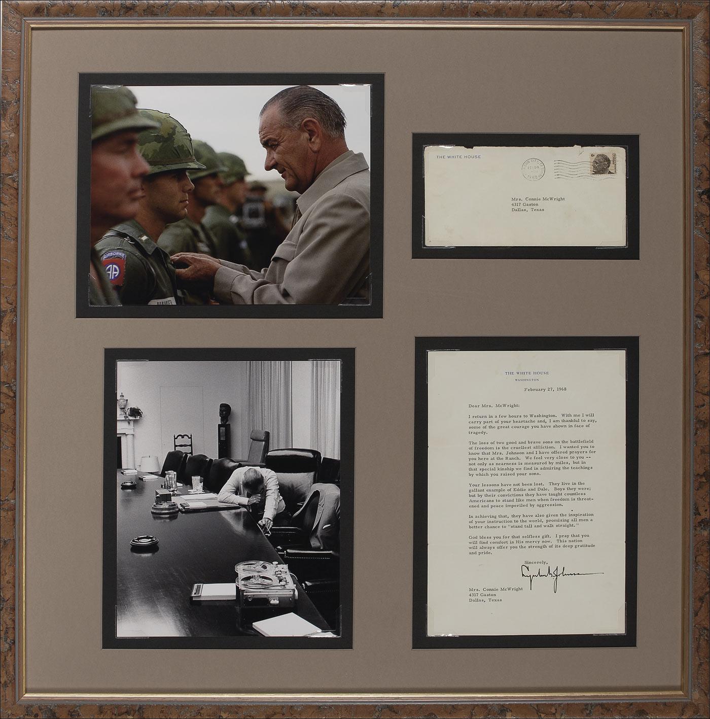 In fine condition, with a few spots of faint toning near the top of the page. Matted with the original mailing envelope postmarked February 28, 1968, a color photo of the president walking a military line of US soldiers, and a photo of a distraught LBJ with his head on a conference table, and framed to an overall size of 26 x 26.75.