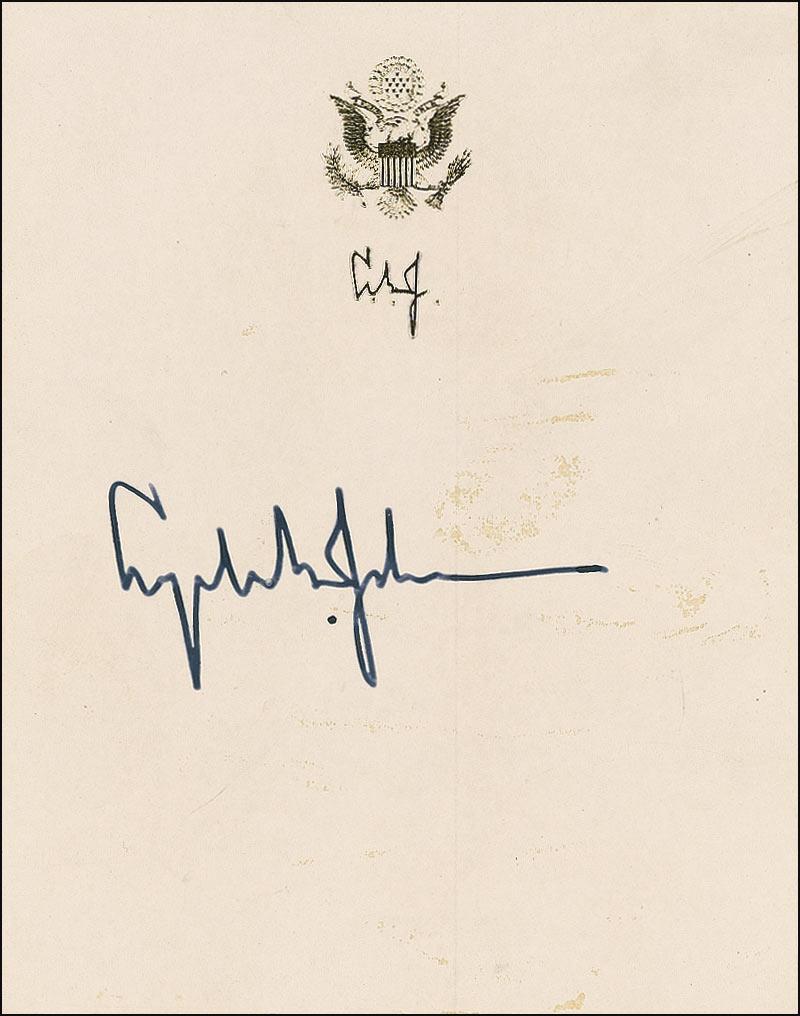Two embossed LBJ bookplates, each 3.75 x 4.75, each signed in black felt tip, “Lyndon B. Johnson.” In overall fine condition, with scattered soiling to both items. Accompanied by letter from Johnson’s secretary to the original recipient regarding LBJ having signed the bookplates. The letter is dated January 16, 1973, six days before the president’s death.