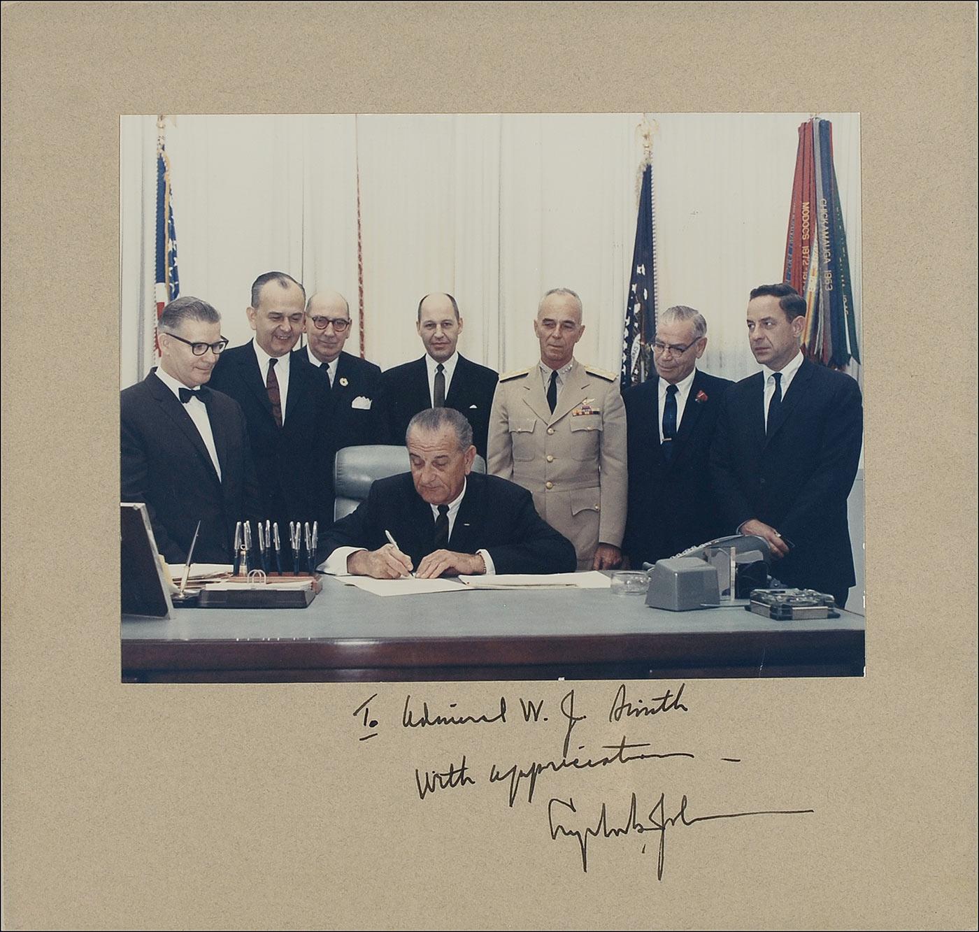Color vintage glossy 9.5 x 7 photo, affixed to its original 12.5 x 12 mount, of Johnson signing a bill at his desk as several gentleman look on, signed and inscribed in black felt tip “To Admiral W. J. Smith, with appreciation—Lyndon B. Johnson.” In fine condition, with some scattered light surface marks to image. In 1966, Johnson appointed Smith to the highest position attainable in the United States Coast Guard, the Commandant of the US Coast Guard with the rank of admiral.