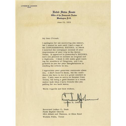 <B>Lyndon B. Johnson Typed Letter Signed.</B></I> One page, 8" x 10.5", U.S. Senate letterhead, June 23, 1959, Washington, D.C., to Reverend Luther C. Peak, Wichita Falls, Texas. It reads in full: "My dear Friend: I apologize for not answering you sooner, but I wanted to wait until I had a copy of the CONGRESSIONAL RECORD, in which I inserted the newspaper account of your impressions of your trip to the Soviet Union. It appeared in yesterday's RECORD, and I am pleased to enclose an original and a duplicate. I think it will make good reading for members of congress, and I am grateful to you for your thoughtfulness in sending the article to me. I appreciate your generous comments about me. I don't deserve them, but the confidence you have in me is a great comfort to me. I only want to serve as Senator from Texas, but being a good Senator is a much easier task when I have friends like you pulling for me back home. Warm regards and best wishes, Sincerely". Folds as expected, light browning, fine condition with a large, bold signature. Included is the <I>Congressional Record</B></I> excerpt mentioned in Johnson's letter.