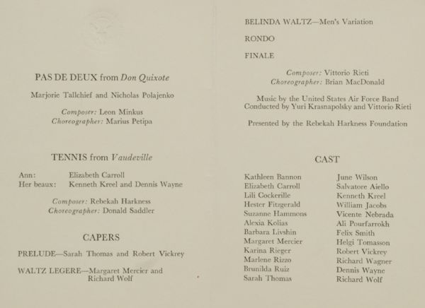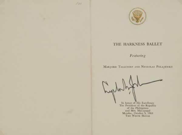 signed Harkness Ballet Program, 1964. Program is signed in black ink as President "Lyndon. B Johnson. The program is embossed with presedential gold seal on top and is for "The Harkeness ballet/Featuring/Marjorie Tallchief and Nicholas Polajenko." The performance was at the whitehouse, on October 5th, 1964 in honor of the phillipine President Diosdado Macapagal. Macapagal, known as "the Incorruptible".