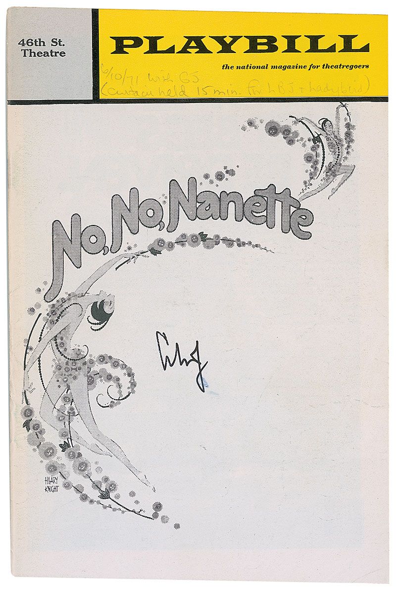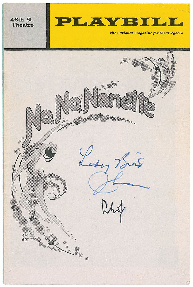 Two playbills for a performance of No, No, Nanette, at the 46th St. Theatre in 1971, both signed in fountain pen by the former president, “LBJ,” with one also signed in blue felt tip, “Lady Bird Johnson.” Collector’s pencil notation to the top of one dates it to June 10, 1971. Scattered bends and creases and some brushing to LBJ’s signatures, otherwise overall fine condition.