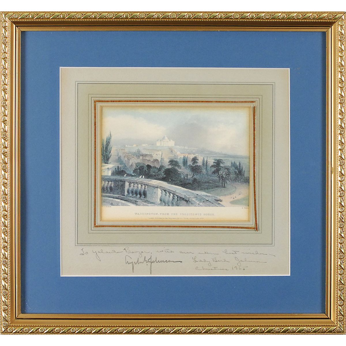 Uncommon 1965 White House Christmas card, 6 x 5, with a color image on the front titled, “Washington, From the President’s House,” matted to a size of 9 x 8.25, signed on the mount in black ink, “Lyndon B. Johnson,” and signed and inscribed to Johnson’s White House secretary, “To Yolanda Boozer, with our warm best wishes, Lady Bird Johnson Christmas 1965.” Display is matted and framed to an overall size of 14 x 13. In fine condition.