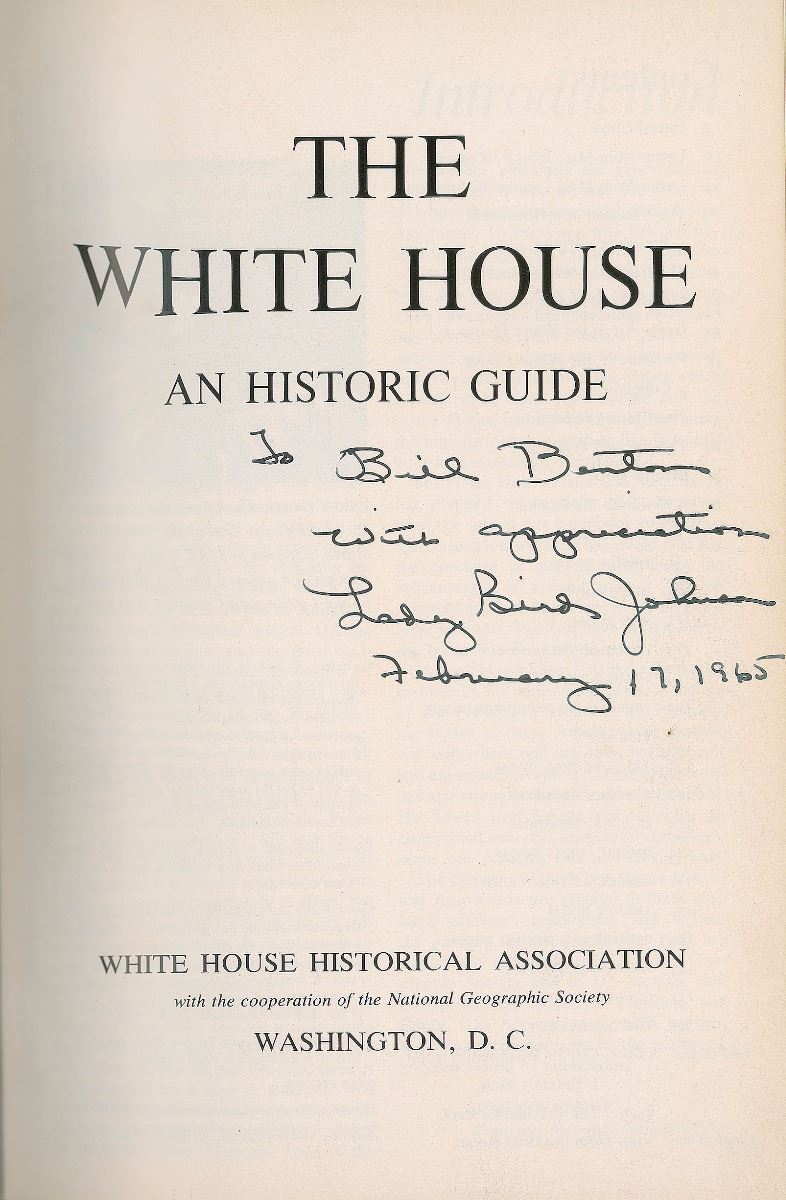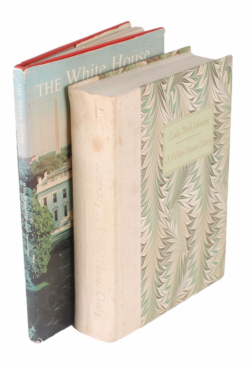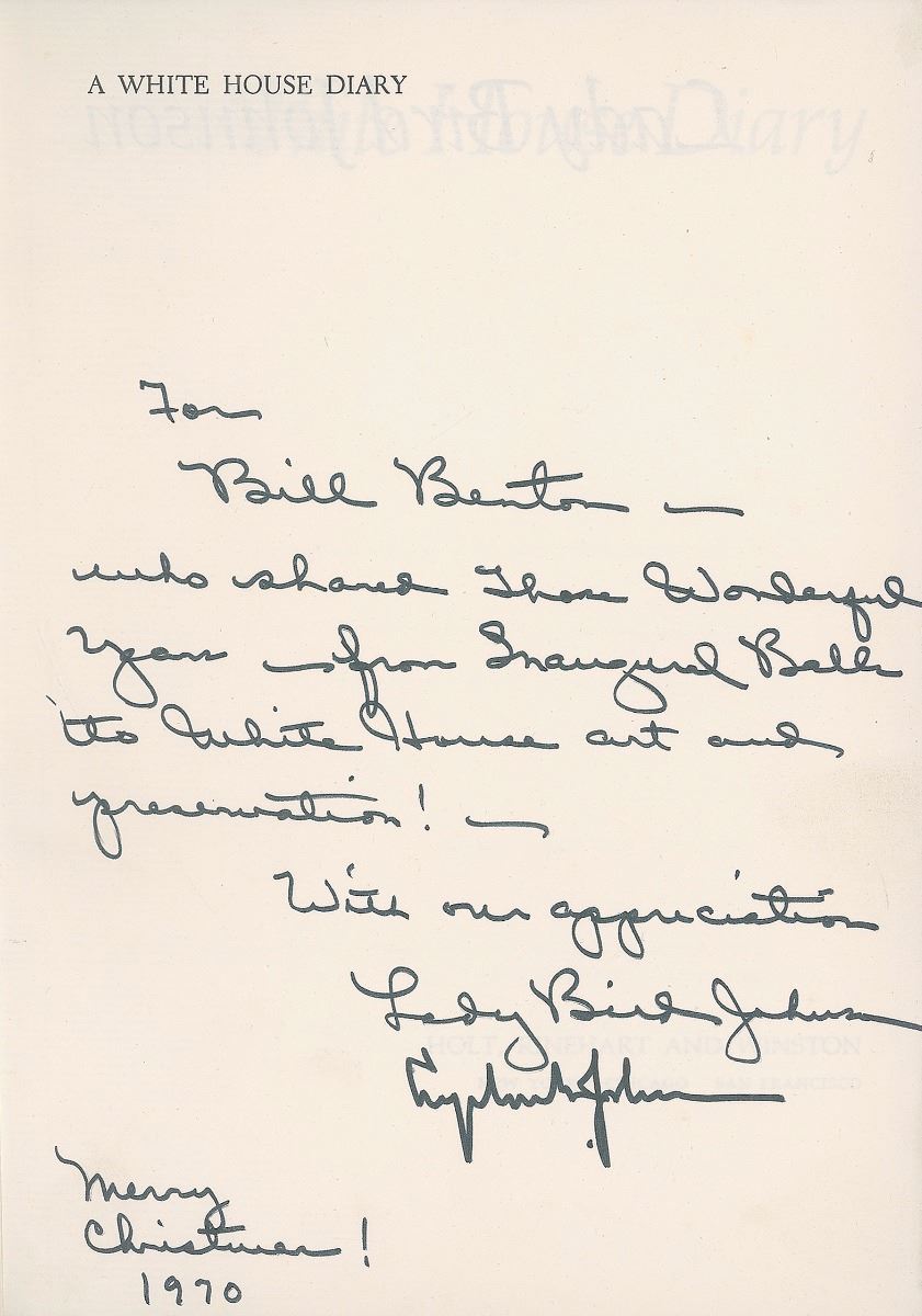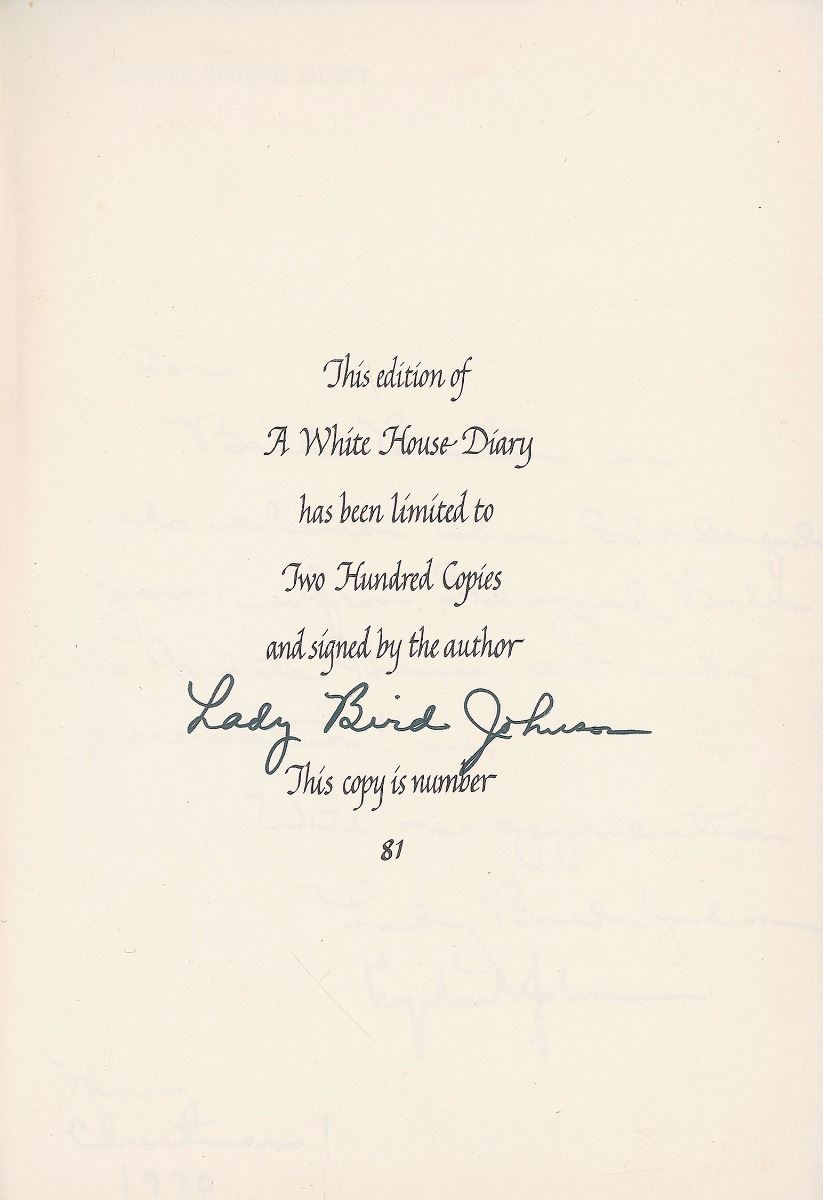 Signed book: A White House Diary. Limited first edition, numbered 80/200. NY: Holt, Rinehart and Winston, 1970. Hardcover, 6.75 x 9.25, 806 pages. Signed on the half-title page in black felt tip, “Lyndon B. Johnson” and “Lady Bird Johnson,” with the latter adding an inscription, “For Bill Benton, who shared those wonderful years—from Inaugural Balls to White House art and preservation! Merry Christmas! 1970.” Also signed on the colophon in black felt tip by the first lady. Also included is a fifth edition of The White House, hardcover with dust jacket, signed and inscribed on the title page in black felt tip, “To Bill Benton, with appreciation, Lady Bird Johnson, February 17, 1965.” In overall fine condition, with fading and slight soiling to spine of Diary, and some small tears and wear to edges of White House dust jacket.