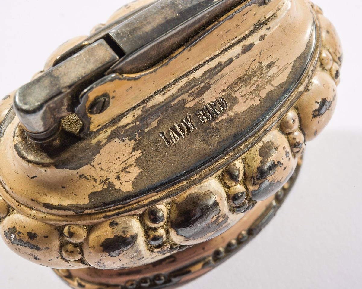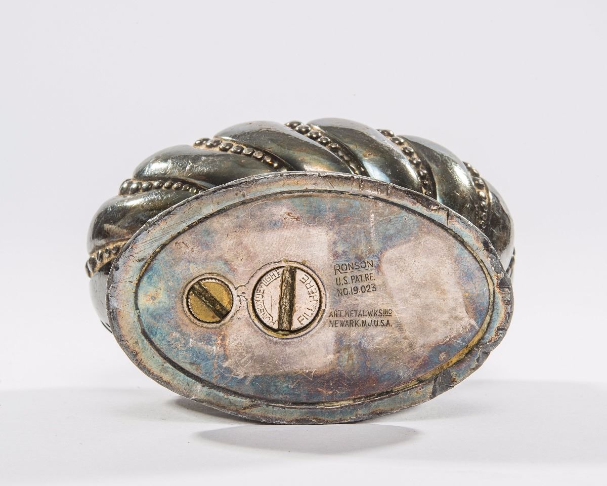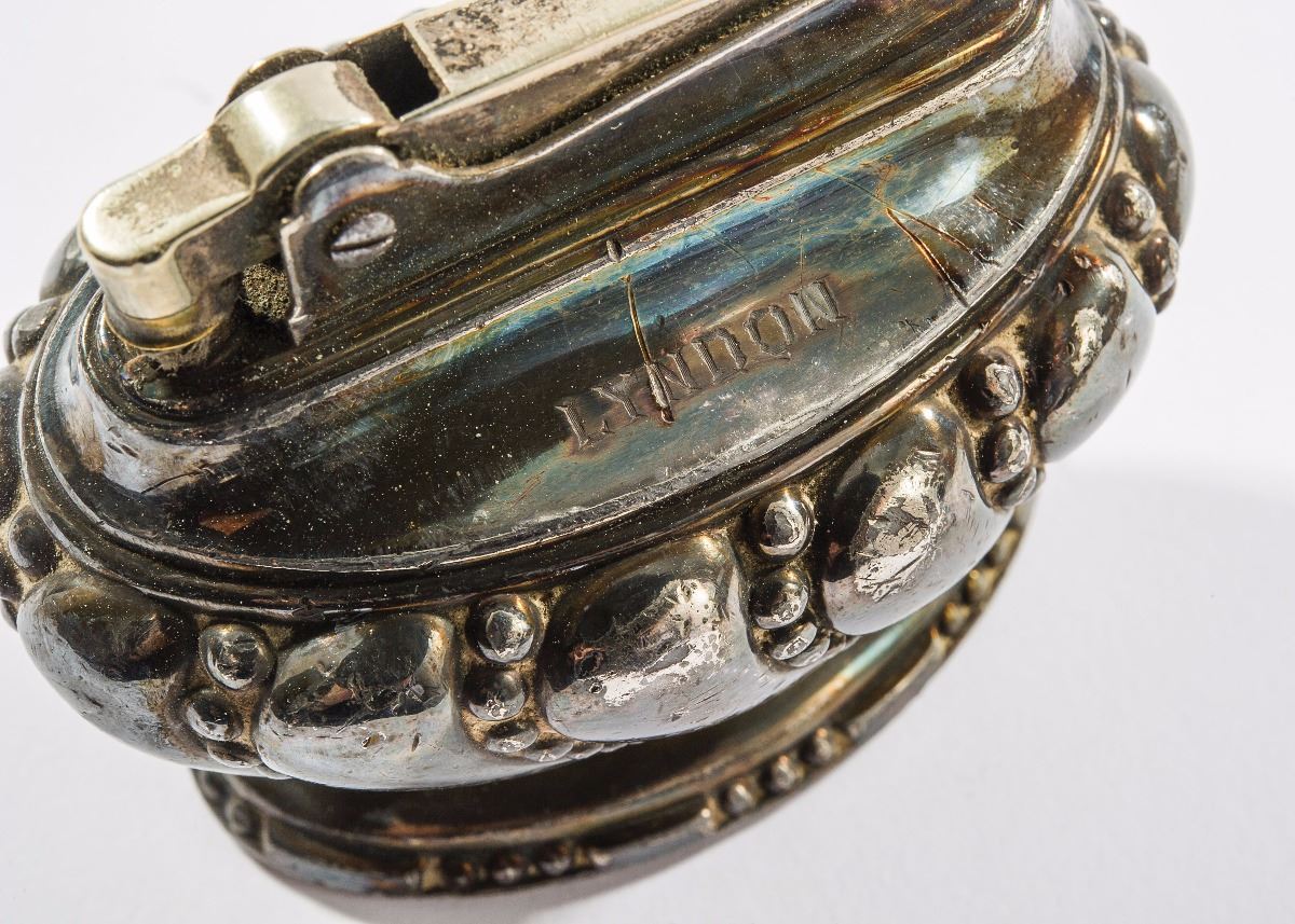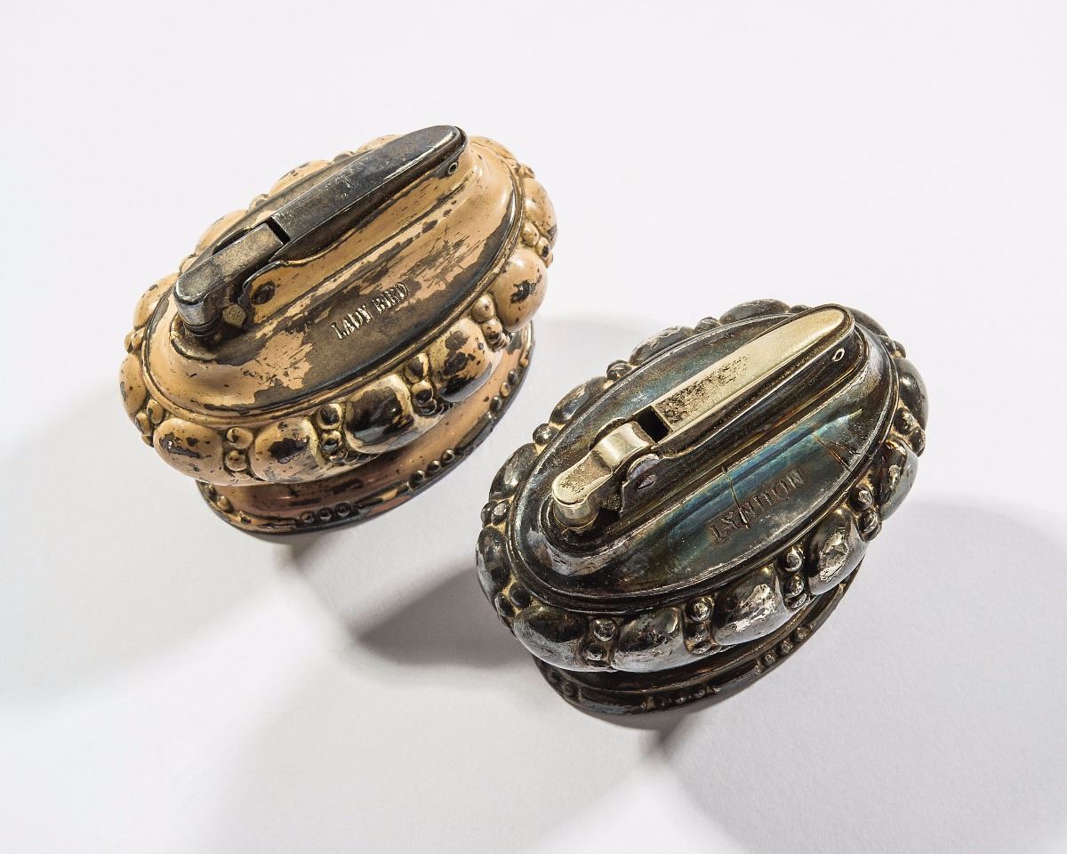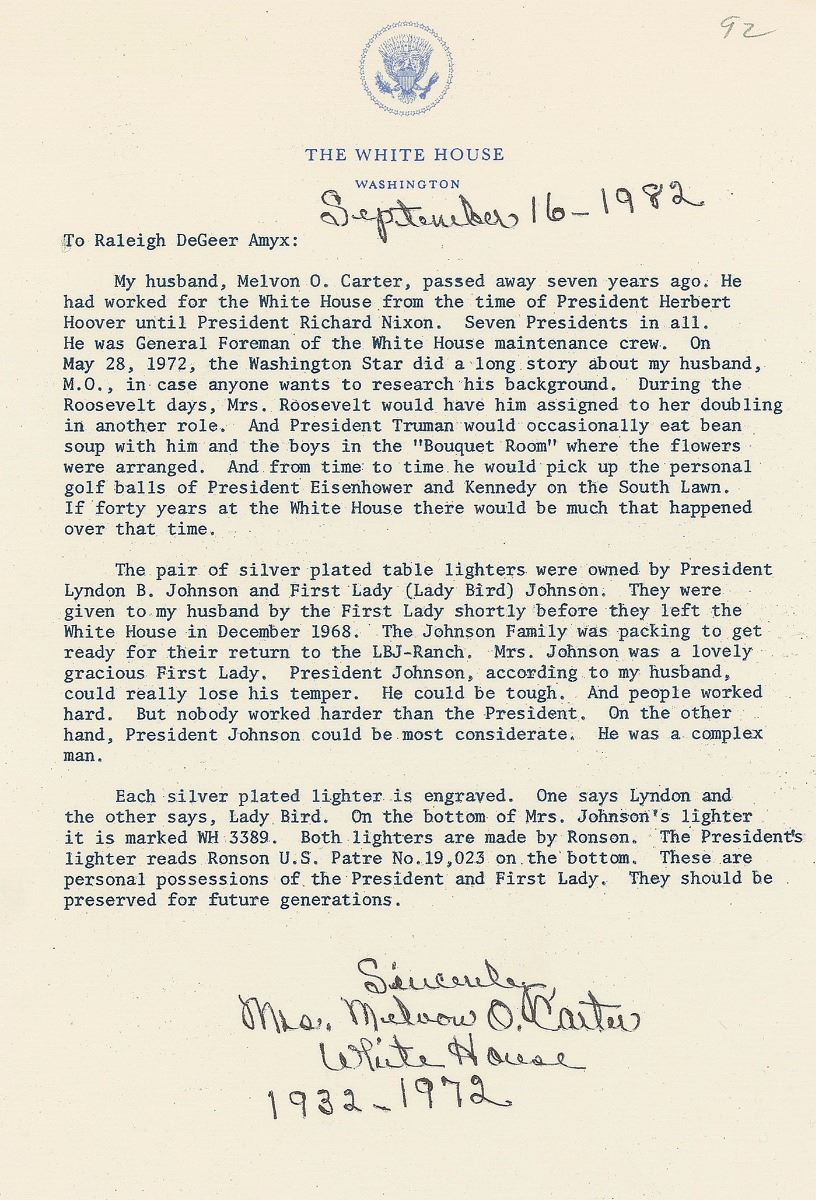 Matching pair of silver-plated table lighters personally-owned and -used by Lyndon and Lady Byrd Johnson, measuring 3 x 2.25 x 1.75, manufactured by Ronson, one engraved “Lyndon” on the top and the other engraved “Lady Bird.” President Johnson’s lighter is a dark metallic gray, and Lady Bird’s is decorated in worn and faded pink paint. Includes a detailed letter of provenance on White House letterhead from the wife of Melvon O. Carter, who had worked on the White House maintenance crew from the time of Presidents Hoover through Nixon. During Mr. Carter’s over 40 years of White House service, he was often in close proximity to the first family and was called upon for a variety of tasks. In part: “The pair of silver plated table lighters were owned by President Lyndon B. Johnson and First Lady (Lady Bird) Johnson. They were given to my husband by the First Lady shortly before they left the White House in December 1968. The Johnson Family was packing to get ready for their return to the LBJ-Ranch…Each silver plated lighter is engraved. One says Lyndon and the other says, Lady Bird. On the bottom of Mrs. Johnson’s lighter it is marked WH 3389. Both lighters are made by Ronson. The Presidents lighter reads Ronson U. S. Patre No. 19,023 on the bottom. These are personal possessions of the President and First Lady.” From the Raleigh DeGeer Amyx Collection.