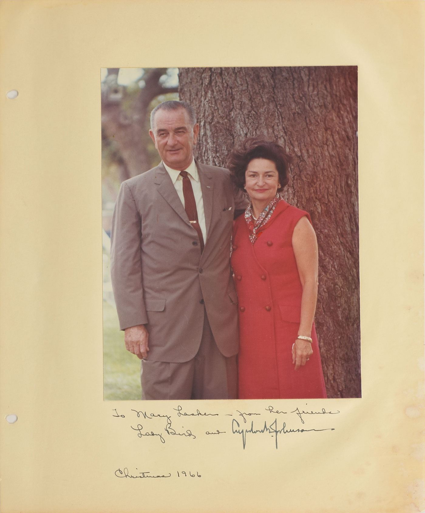 Color glossy 7.25 x 9.25 photo of President and First Lady Johnson, affixed to the original 11.75 x 14.25 paperstock mount, signed and inscribed on the mount in black ink, "To Mary Lasker—from her friends, Lady Bird and," and in fountain pen, "Lyndon B. Johnson," with Lady Bird adding the date below, "Christmas 1966.” In very good to fine condition, with two punch holes to the left side, and some rippling and dampstaining to the lower right edge, most of which could be matted out. Lasker was an American health activist and philanthropist, who worked to raise funds for medical research and founded the Lasker Foundation. She helped convince Eleanor Roosevelt to endorse Lyndon Johnson's efforts to become the 1960 Democratic nominee, and Lady Bird glowingly mentions Lasker in her book A White House Diary. Lasker was the recipient of the Presidential Medal of Freedom in 1969.