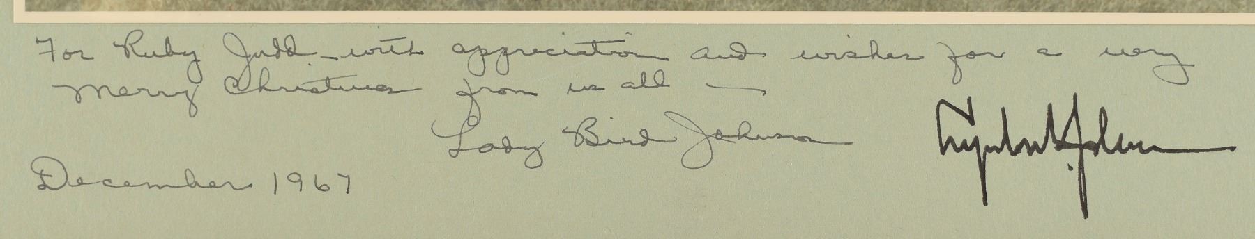 Color glossy 11.5 x 8.25 photo of the Johnson family outside the White House, affixed to its original 15 x 12 mount, signed and inscribed on the mount in black ink, "For Ruby Judd—with appreciation and wishes for a very Merry Christmas from us all—Lady Bird Johnson, December 1967" and "Lyndon B. Johnson.” In fine condition.
