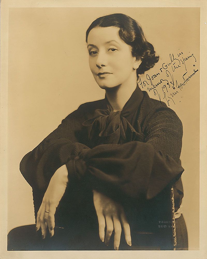 Gorgeous vintage sepia matte-finish 8 x 10 portrait by Vandamm of New York, signed and inscribed in fountain pen, “For Joan & Gully, in memory of the spring of 1933, Lynn ‘Fontanne.’” In fine condition, with mild silvering to dark areas of the image.