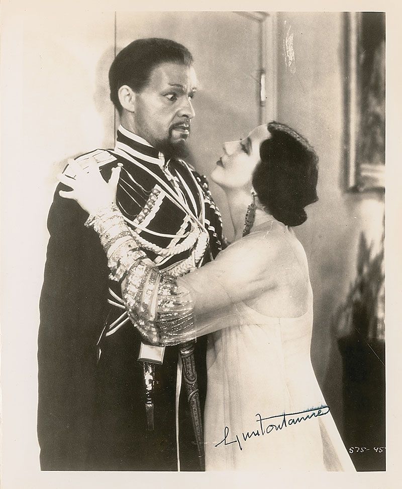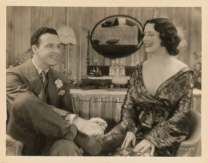 Two glossy photos of Fontanne with husband and acting partner Alfred Lunt in different roles, 8 x 10 and 10 x 8, each signed in black ink. In overall fine condition. Married in 1922, Fontanne and Lunt became the pre-eminent Broadway couple, appearing together in over 20 plays, a film, several radio dramas, and a few television productions before their retirement in 1966. They were presented with the Presidential Medal of Freedom by President Lyndon Johnson, and left their mark on Broadway with the Lunt-Fontanne Theatre. An excellent pairing of photos.