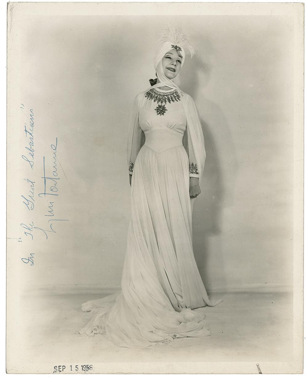 Vintage pearl-finish 8 x 10 photo of Fontanne in character, signed in blue ballpoint, “In ‘The Great Sebastians,’ Lynn Fontanne.” In fine condition, with scattered light surface creasing, one just touching the side of her head, and a date stamp along the bottom border.
