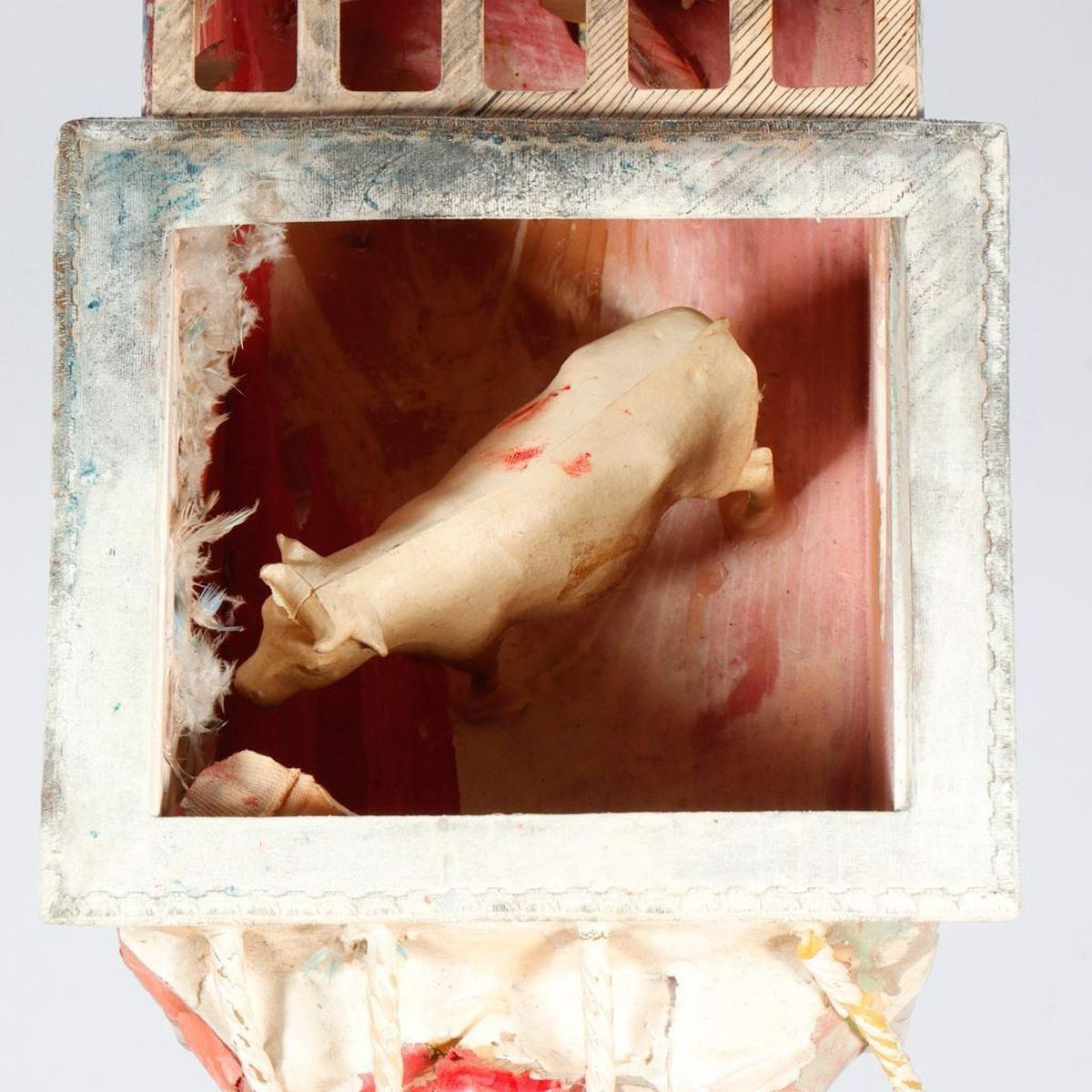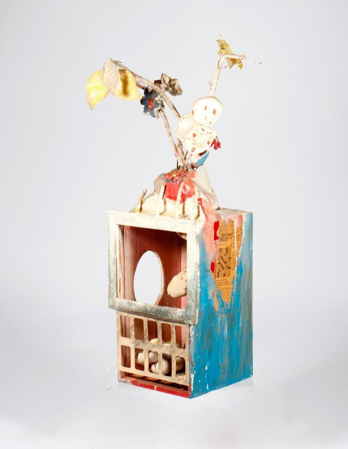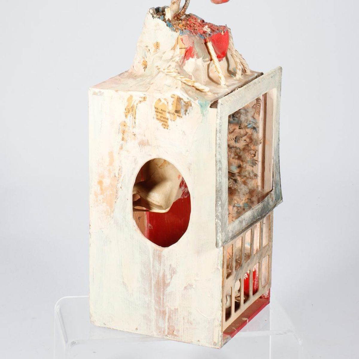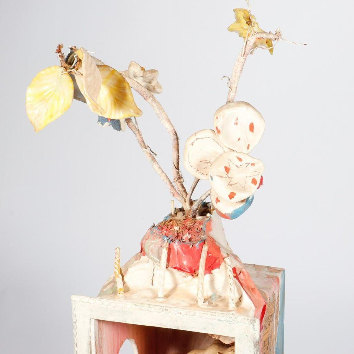 Artist: Lynn Landor (Contemporary). Title/Subject: "Birthday Box". Size: 20in tall x 7in x 6in. Year Created: 1966. Signed: Signed/inscribed: "To George, With Love". Medium/Ground: Mixed media/found object sculpture. Condition: Some leaves/grapes have come detached from the top, but most appear to be present; one of the candles is broken but still attached. Condition Report: All lots are sold as is and where is. Turner Auctions + Appraisals, LLC provides condition reports upon request to aid in your bidding decision. No statement regarding age, condition, kind, value, or quality of a lot, whether made orally at the auction or at any other time, or in writing in this catalog or elsewhere, shall be construed to be an express or implied warranty, representation, or assumption of liability. All sales are final, Turner Auctions + Appraisals, LLC does not give refunds based on condition. Turner Auctions + Appraisals, LLC does not perform any shipping or packing services. We do have a list of suggested shippers who gladly provide quotes prior to your bidding. Please visit our webpage for a list of recommended shippers.