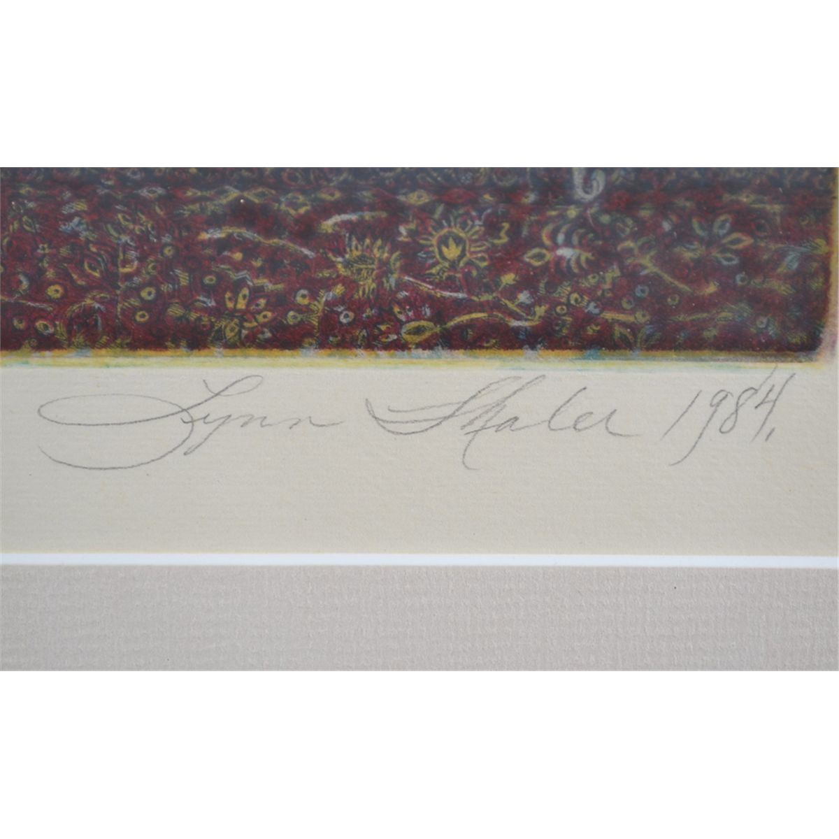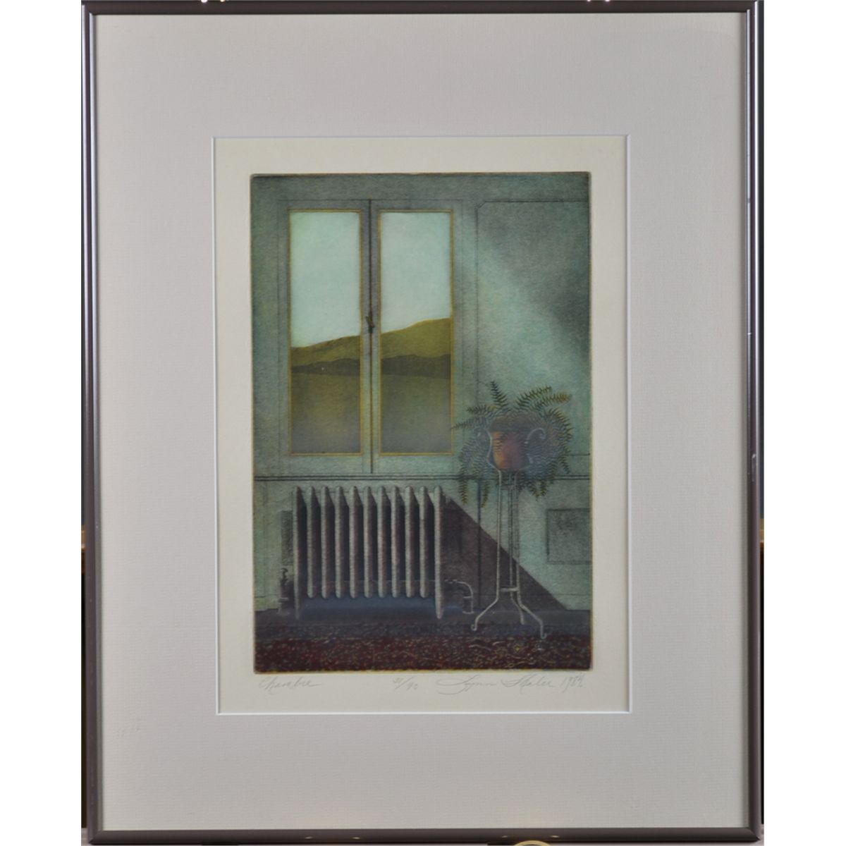 Titled, "Chambre," depicting a window with heater below and a fern plant on a stand. Signed in pencil in LR and dated 1984, titled in pencil in LL and edition 31/90 in LC. Lynn Shaler (1955-), US, is known for her color acquaint etchings. Matted and framed behind glass, 13.75" H x 9.25" W, sight, 23.25" H x 18.75" W, framed. Private collection St. Clair Shores, MI.