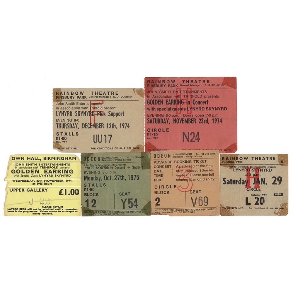 Group lot of six early ticket stubs for UK concerts by Lynyrd Skynyrd, ranging in size from 2.5 x 2.25 to 3.5 x 3, with shows as follows: Birmingham Town Hall, Birmingham, on November 20, 1974; Rainbow Theater, London, on November 23, 1974; Rainbow Theatre, London, on December 12, 1974; Hammersmith Odeon, London, on October 27, 1975; Hammersmith Odeon, London, on February 15, 1976; and Rainbow Theatre, London, on January 29, 1977. In overall very good to fine condition, with old tape stains to the corners of four of the tickets.