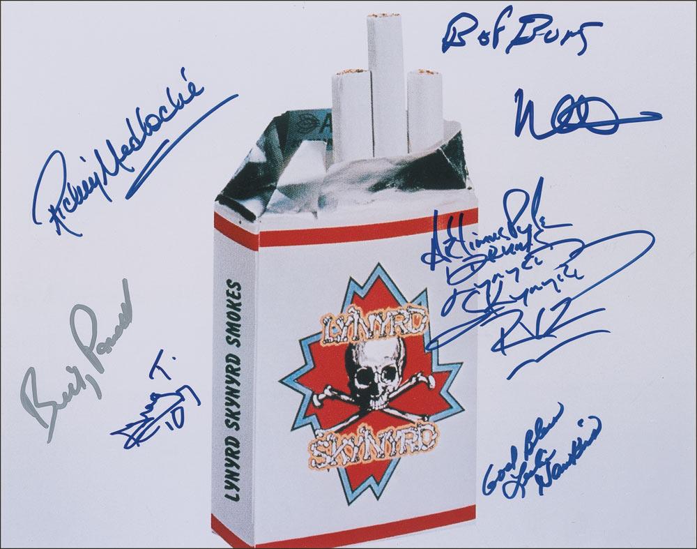 Color satin-finish 14 x 11 photo of their Smokes album art, signed in blue felt tip by Artimus Pyle, Bob Burns, Rickey Medlocke, Greg T. Walker, legendary producer Al Kooper, and original ‘Honkette’ Leslie Hawkins, and signed in silver ink by Billy Powell. In very fine condition.