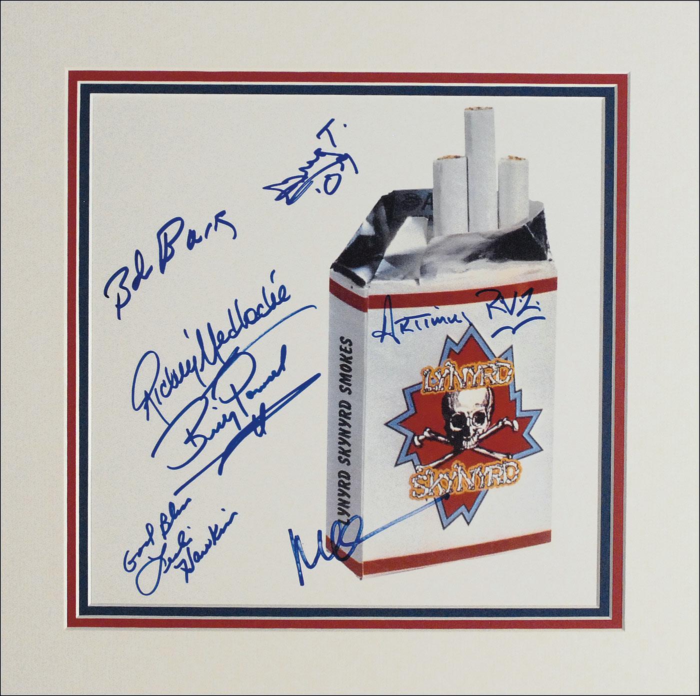 Color 10.5 x 11 print of the Smokes album cover, signed in blue felt tip by Artimus Pyle (signed “Artimus R.V.Z.”), Billy Powell, Bob Burns, Rickey Medlocke, Greg T. Walker, Leslie Hawkins, and legendary producer Al Kooper. Triple-matted to an overall size of 15 x 15. In fine condition.