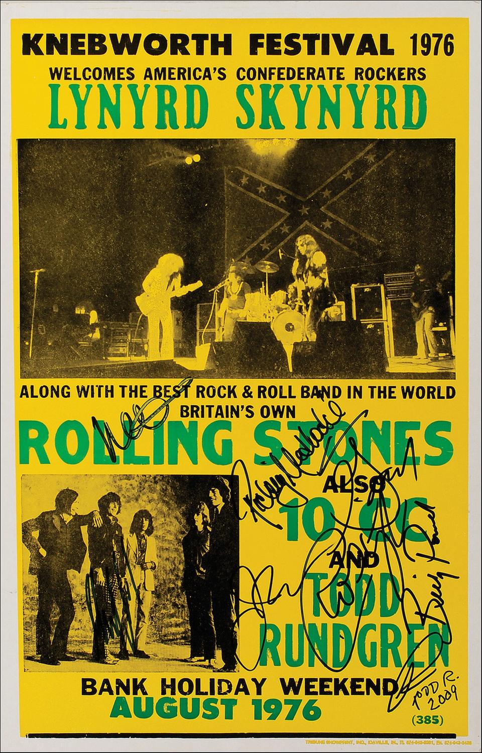 Color 14 x 22 reproduction poster of Lynyrd Skynyrd’s 'Knebworth Festival 1976' tour with The Rolling Stones and Utopia, signed in felt tip by Mick Taylor of The Rolling Stones, Gary Rossington, Billy Powell, Rickey Medlocke, Johnny VanZant and Al Kooper of Lynyrd Skynyrd, and Todd Rundgren of Utopia. In fine condition, with some trivial corner creasing.