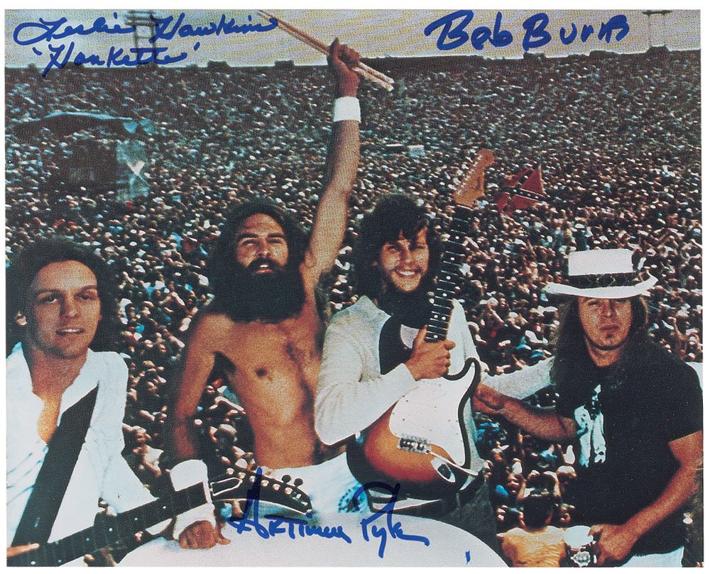 Color glossy 10 x 8 photo of the band posing onstage before a sea of people, signed in blue felt tip by Artimus Pyle, Bob Burns, and Leslie Hawkins, adding “Hankette.” In fine condition, with a bit of a grainy appearance.