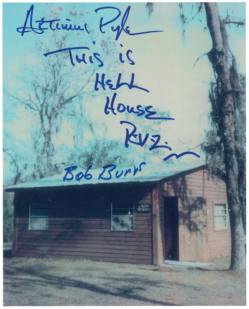 Color glossy 8 x 10 photo of the Skynyrd ‘Hell House,’ signed in blue felt tip, “Artimus Pyle, This is Hell House. R.V.Z,” and “Bob Burns.” In very fine condition.