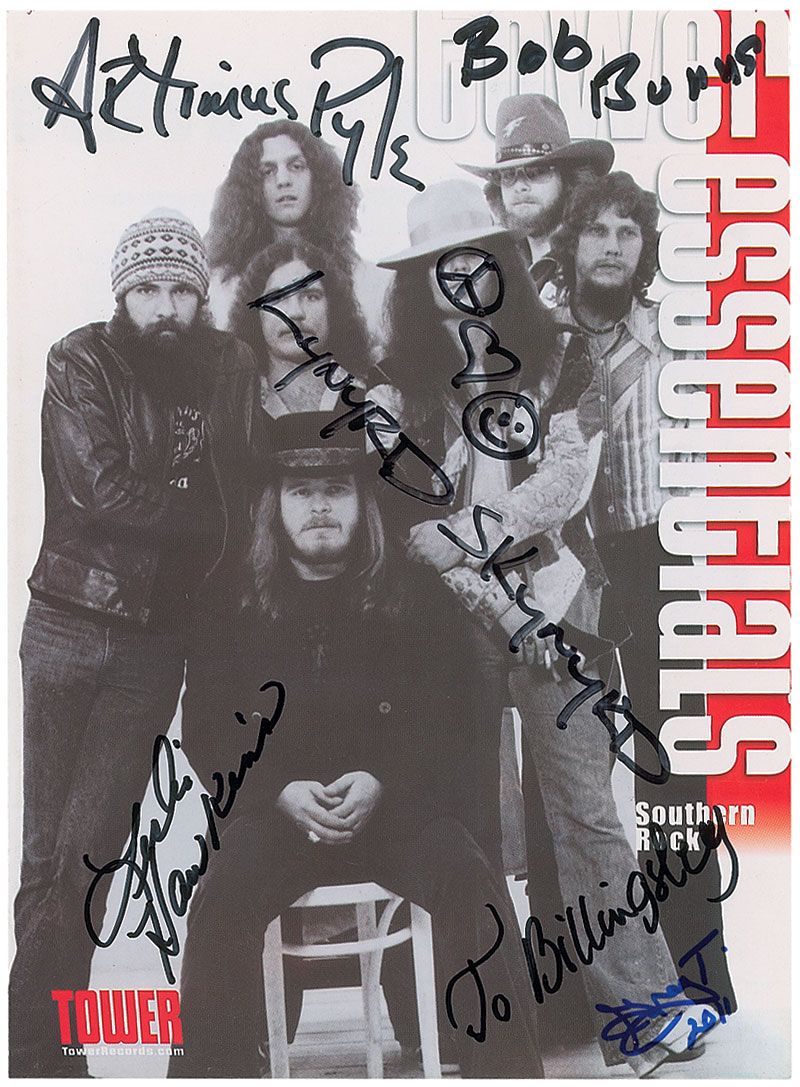 Tower Records ‘Cover Essentials’ booklet, 5.5 x 7.5, signed on the front cover in black felt tip by Artimus Pyle, Bob Burns, Leslie Hawkins, Joe Billingsley, and Greg T., with one adding the band’s name, a heart, peace sign, and a happy face. In fine condition.