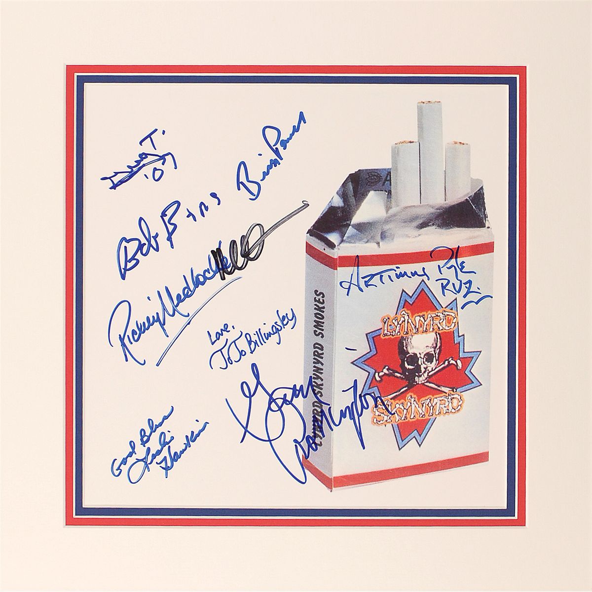 Color glossy 10.25 x 10.75 photo of the band’s Smoke album cover, signed in blue and black felt tip by Gary Rossington, JoJo Billingsley, Greg T. Walker, Rickey Medlocke, Bob Burns, Leslie Hawkins, Artimus Pyle, Billy Powel and legendary producer Al Kooper. Triple matted to an overall size of 15 x 15. In fine condition.