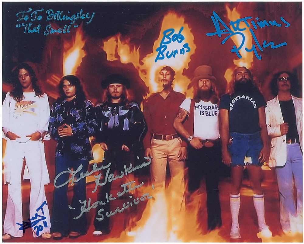 Color glossy 10 x 8 photo of the Street Survivors album cover, signed in ink and felt tip, “JoJo Billingsley ‘That Smell,’” “Bob Burns,” “Artimus Pyle,” “Greg T. 2011,” and “Leslie Hawkins ‘Honkette Survivor.’” In fine condition.