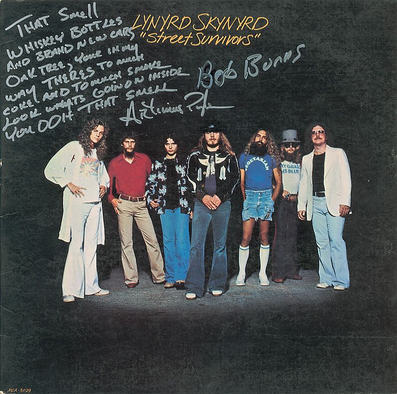 Street Survivors album signed on the front cover in silver ink by Bob Burns and Artimus Pyle, who writes the lyrics to the first verse of ‘That Smell.’ Some light cover wear and creases and a mild ‘ring of wear’ to back cover, otherwise fine condition. The record is not included.