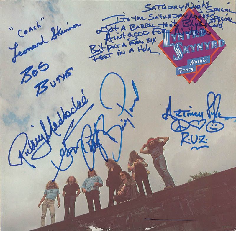 Nuthin’ Fancy album signed on the front cover in blue felt tip by Billy Powell, Gary Rossington, Bob Burns, Rickey Medlocke, ‘Coach’ Leonard Skinner, and Artimus Pyle, who adds a verse of lyrics to ‘Saturday Night Special.’ Some light surface and edge wear, and a slight brush to end of Pyle’s signature, otherwise fine condition. The record is not included.