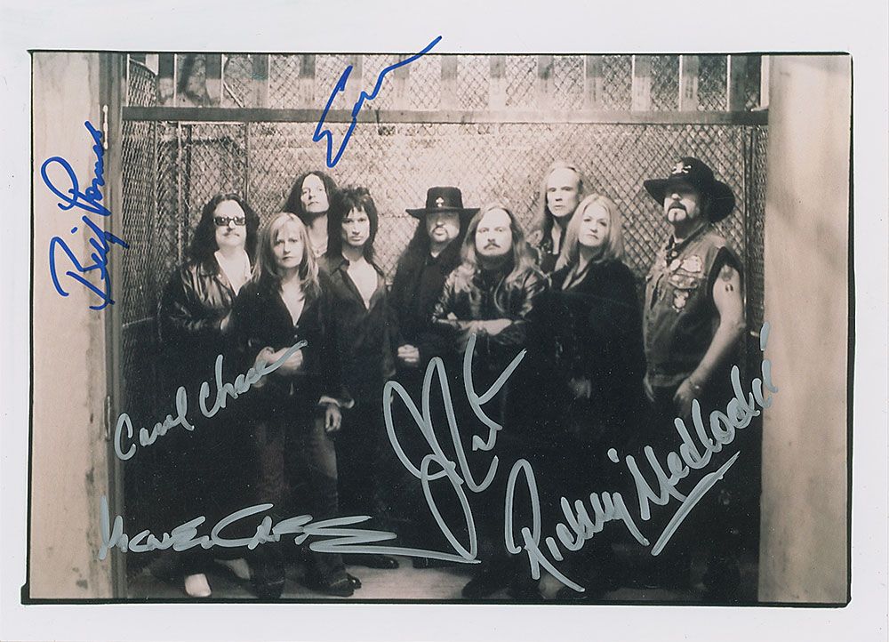 Satin-finish 11 x 8 photo of the band, signed in silver ink and blue felt tip by six members: Billy Powell, Johnny Van Zant, Rickey Medlocke, Ean Evans, Michael Cartellone, and Carol Chase. In fine condition.