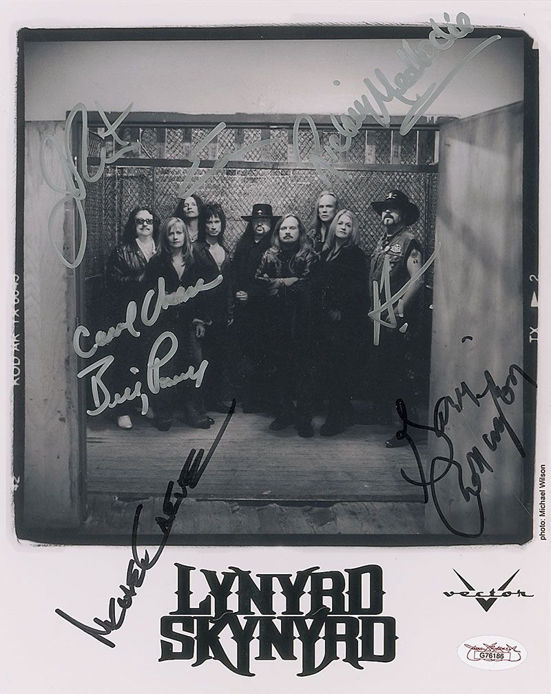 Satin-finish 8 x 10 Vector Records group promotional photo, signed in silver ink and black felt tip by six members including Gary Rossington, Billy Powell, Carol Chase, and Rickey Medlocke. In fine condition, with a James Spence authentication label affixed to lower corner. Accompanied by a certificate of authenticity from James Spence.