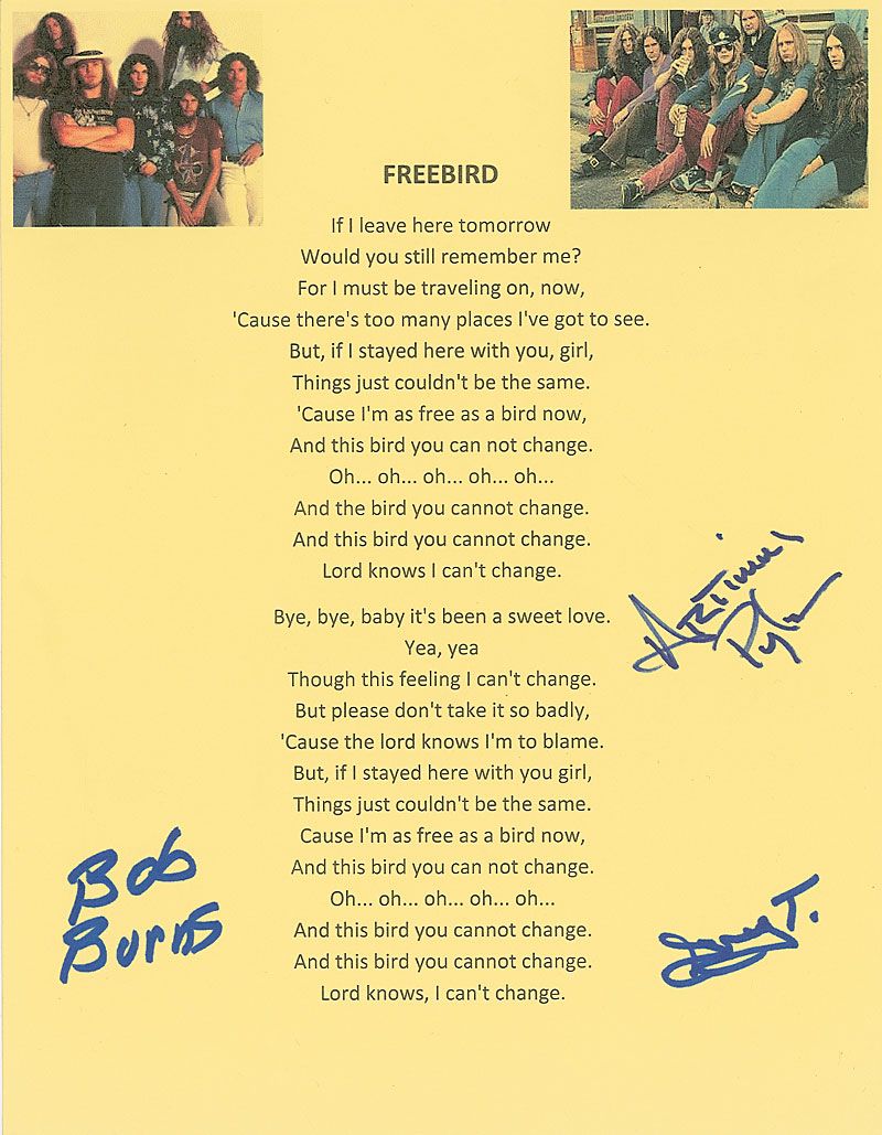 Souvenir printed lyrics to ‘Freebird’ on an 8.5 x 11 sheet of yellow cardstock, with two printed images of the band at the top, signed in blue felt tip by Bob Burns, Artimus Pyle, and Greg T. [Walker]. In very fine condition.