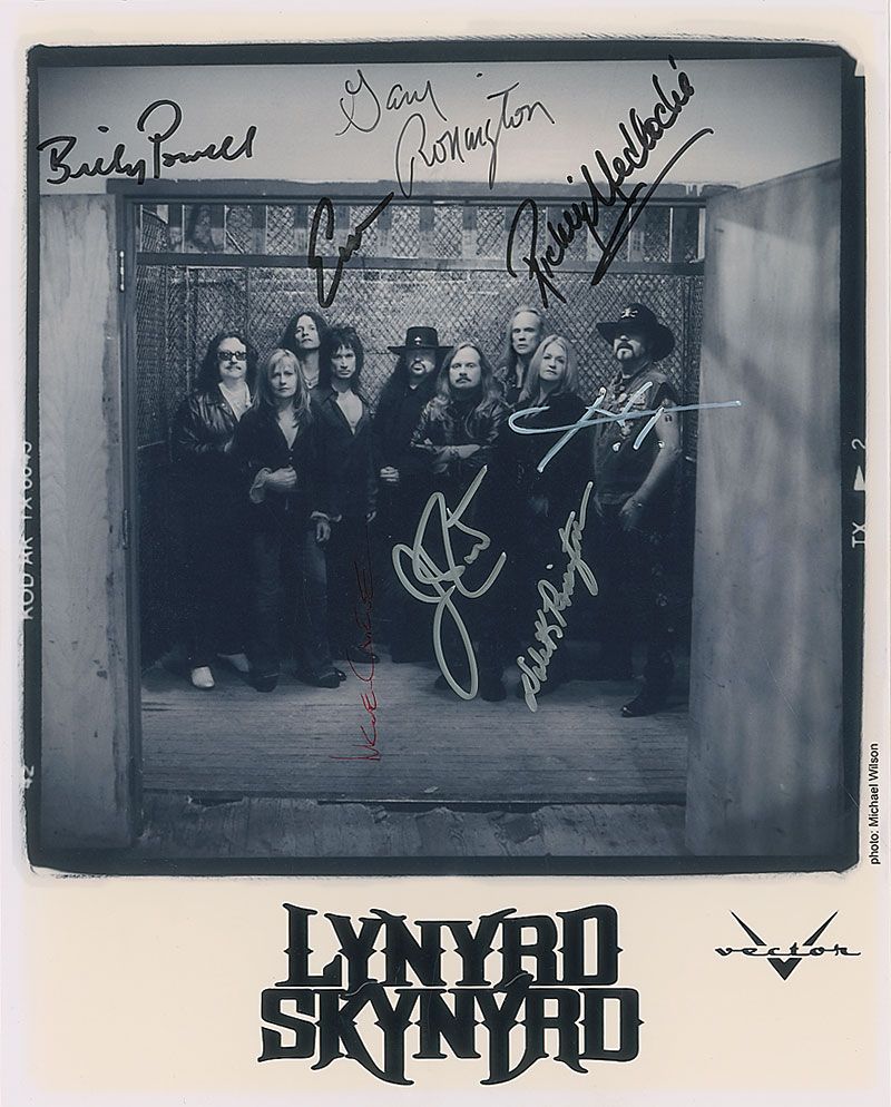 Satin-finish 8 x 10 Vector group publicity photo, signed in ink by Billy Powell, Gary Rossington, Hughie Thomasson, Rickey Medlocke, Johnny Van Zant, Ean Evans, Dale Rossington, and Michael Cartellone. In fine condition, with light contrast to Cartellone’s signature.