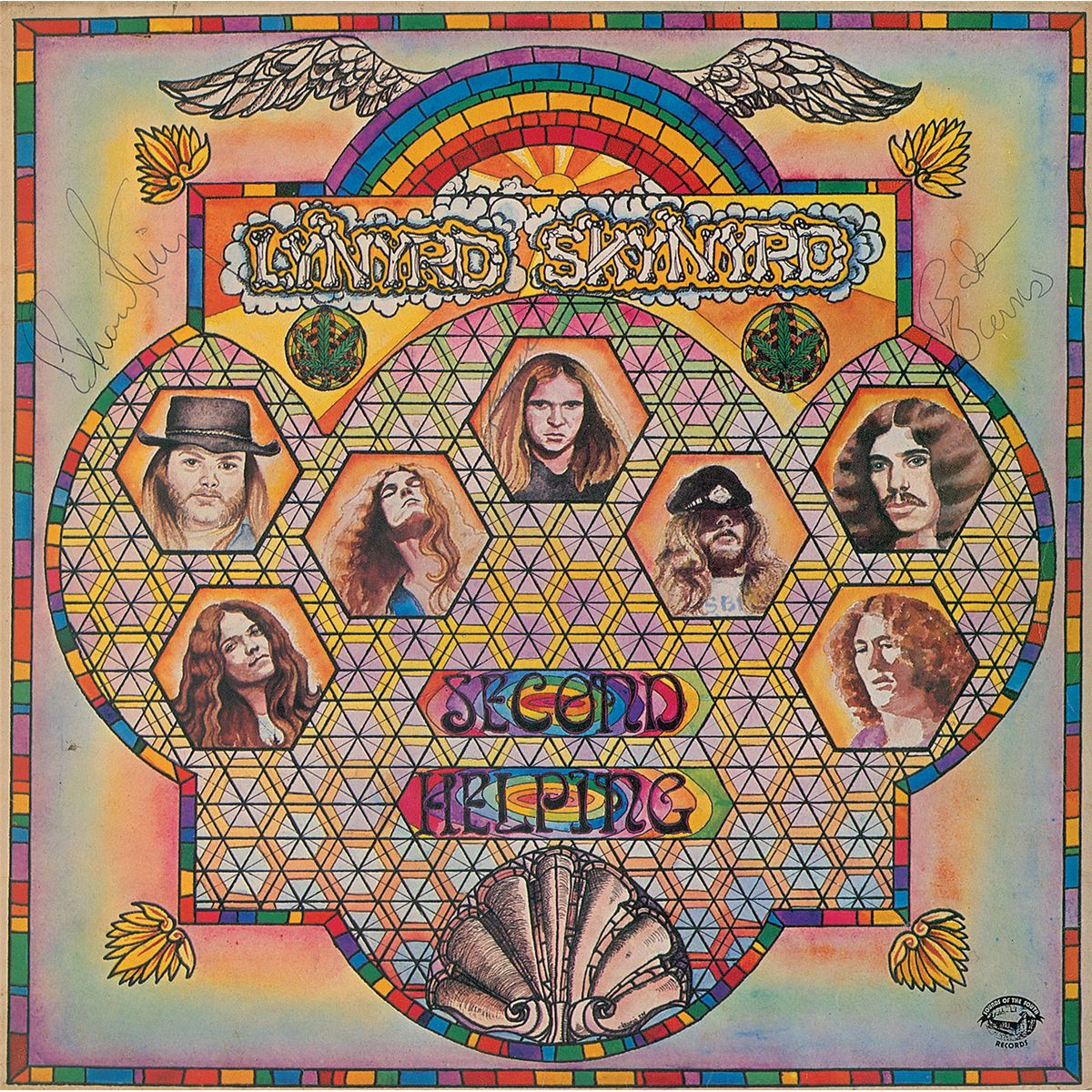 Second Helping promo factory sample album signed on the front cover in ink and ballpoint, “Ronnie,” “Edward King,” and “Bob Burns,” and signed on the back cover in ballpoint, “God bless you, Allen Collins,” “Leon Wilkeson,” “God bless you, Bill Powell,” “God bless you Gary Rossington,” and “Bob Burns.” In fine condition, with moderate contrast to Van Zant’s signature, a few creases, and some scattered light soiling. The record is included. Signatures were originally obtained by a porter at the Queensway Hotel in London in 1974, who was presented the album for his exceptional service when the band departed. Upon his arrival home, he gave the album to his son. The band embarked on a quick three-week tour of Europe in the middle of their 1974 Nuthin’ Fancy tour, where they opened for Humble Pie and Queen.