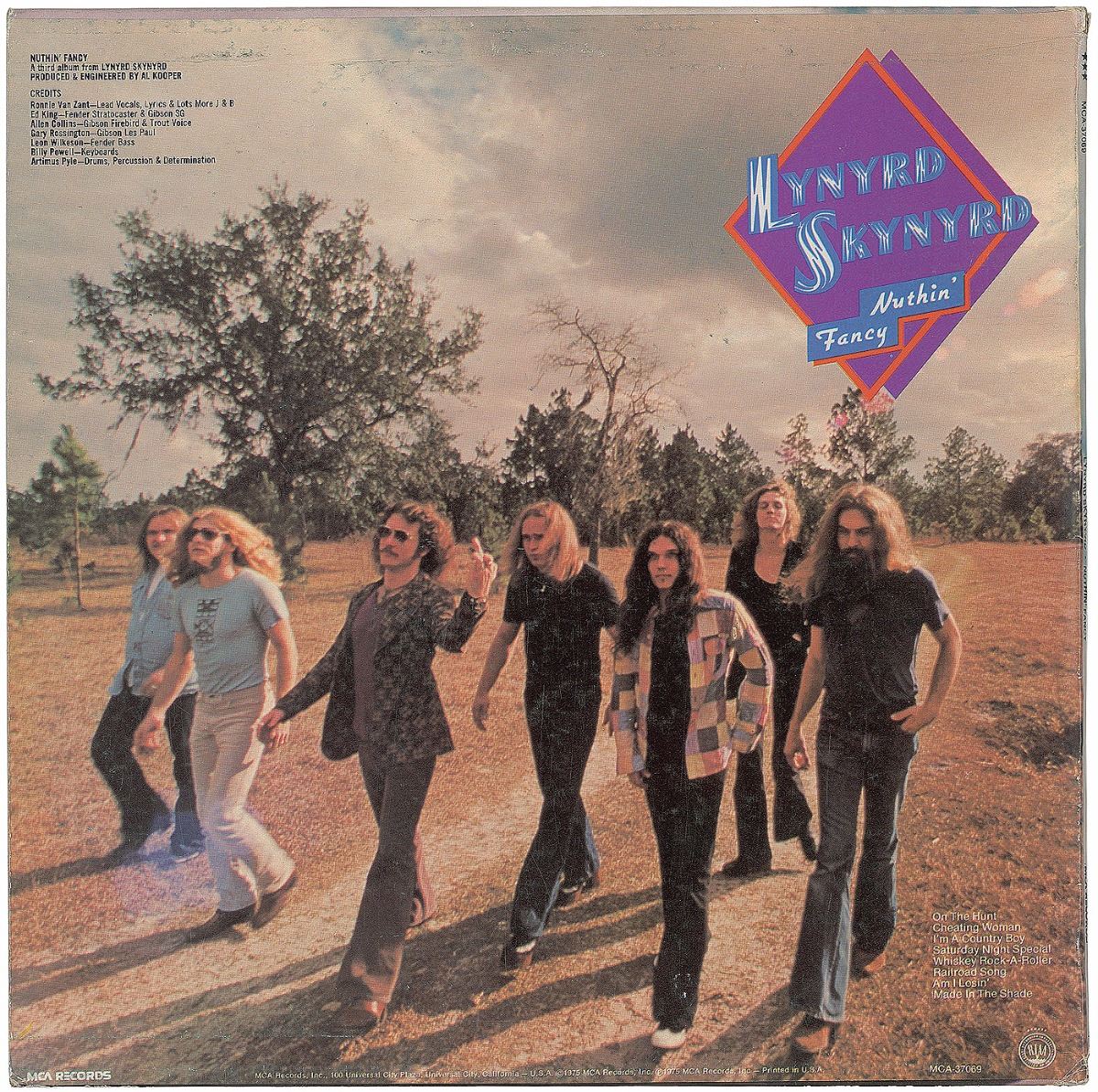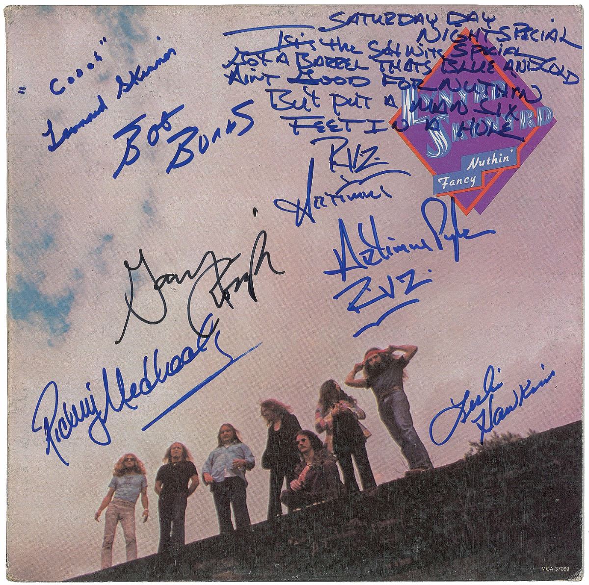 Nuthin’ Fancy album signed on the front cover in black felt tip, “Gary Rossington,” and in blue felt tip, “ ‘Coach,’ Leonard Skinner,” “Bob Burns,” “Leslie Hawkins,” “Rickey Medlocke,” and “Artimus Pyle, R. V. Z,” who adds lyrics from the song ‘Saturday Night Special,’ and signs again with his first name and Ronnie Van Zant’s initials. In fine condition, with slight edgewear. The record is not included.