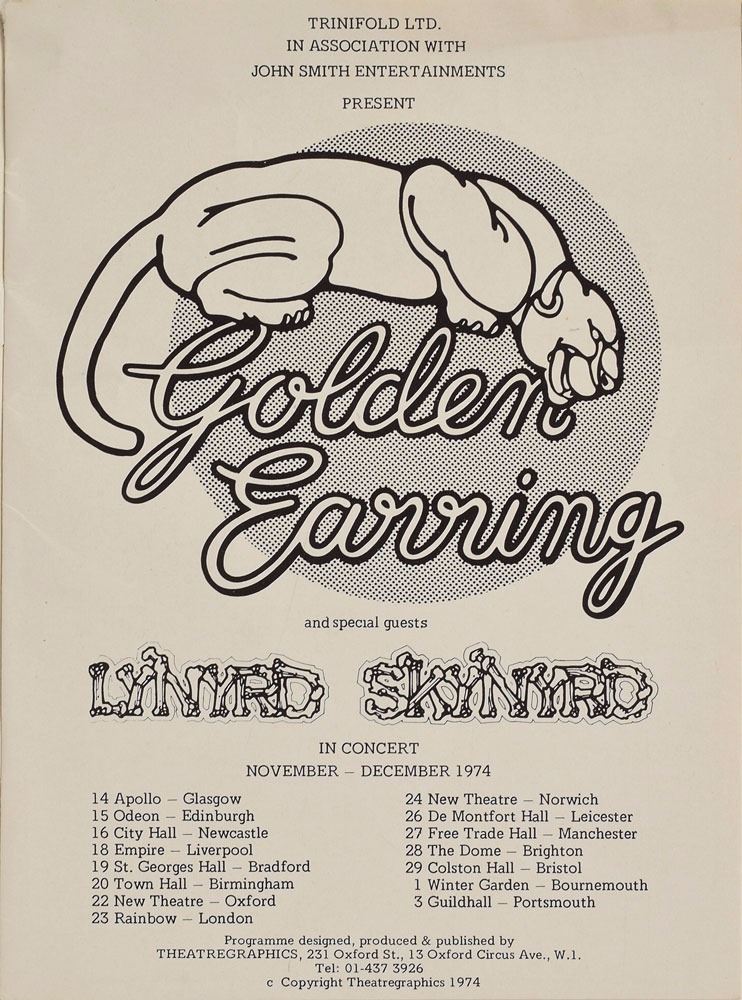 Golden Earring and Lynyrd Skynyrd 1974 UK tour booklet retrieved from the tragic site of the 1977 Lynyrd Skynyrd plane crash. The booklet belonged to former Lynyryd Skynyrd guitar tech Craig Reed, and was recovered from his briefcase at the site of the crash. Reed was a passenger on the band's tragic flight bound for Baton Rouge, Louisiana, on October 20, 1977, which resulted in the deaths of Ronnie Van Zant, Steve and Cassie Gaines, assistant road manager Dean Kilpatrick, and pilots Walter McCreary and William Gray. In very good condition, with scattered light creasing and paper loss to the upper right corner of the cover. Accompanied by a certificate of authenticity signed by Reed.