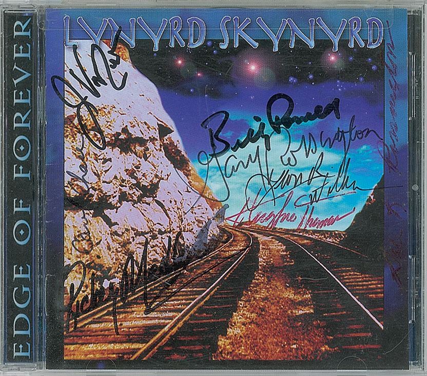 Edge of Forever CD by Lynyrd Skynyrd, signed on the front of the booklet in various ink types by Johnny Van Zant, Gary Rossington, Billy Powell, Leon Wilkeson, Rickey Medlocke, Hughie Thomasson, Dale Krantz-Rossington, and Carol Chase. In fine condition. The CD is included.